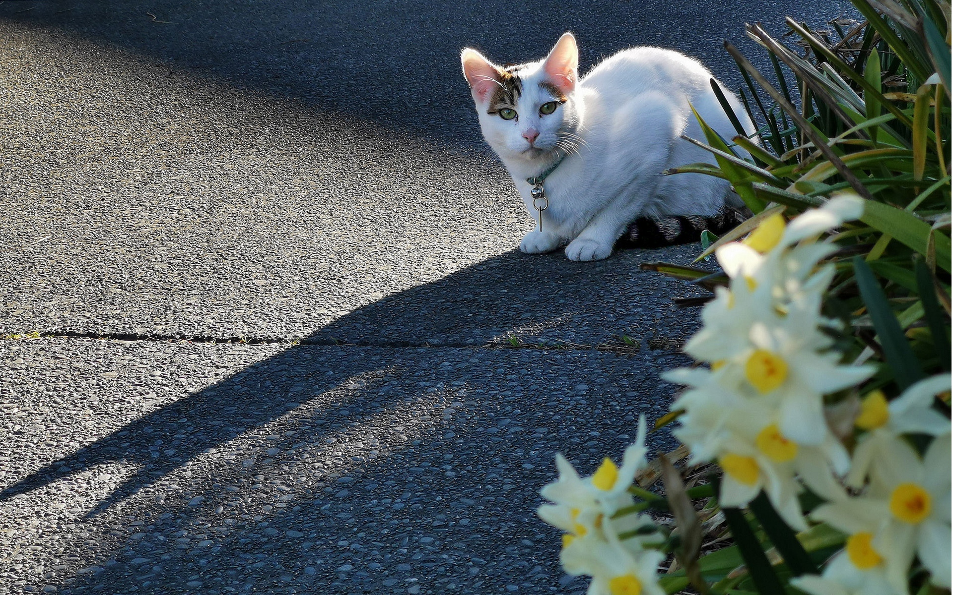 Description: A white cat sitting on the ground next to flowers and plants on the side of the road with a shadow of the cat.