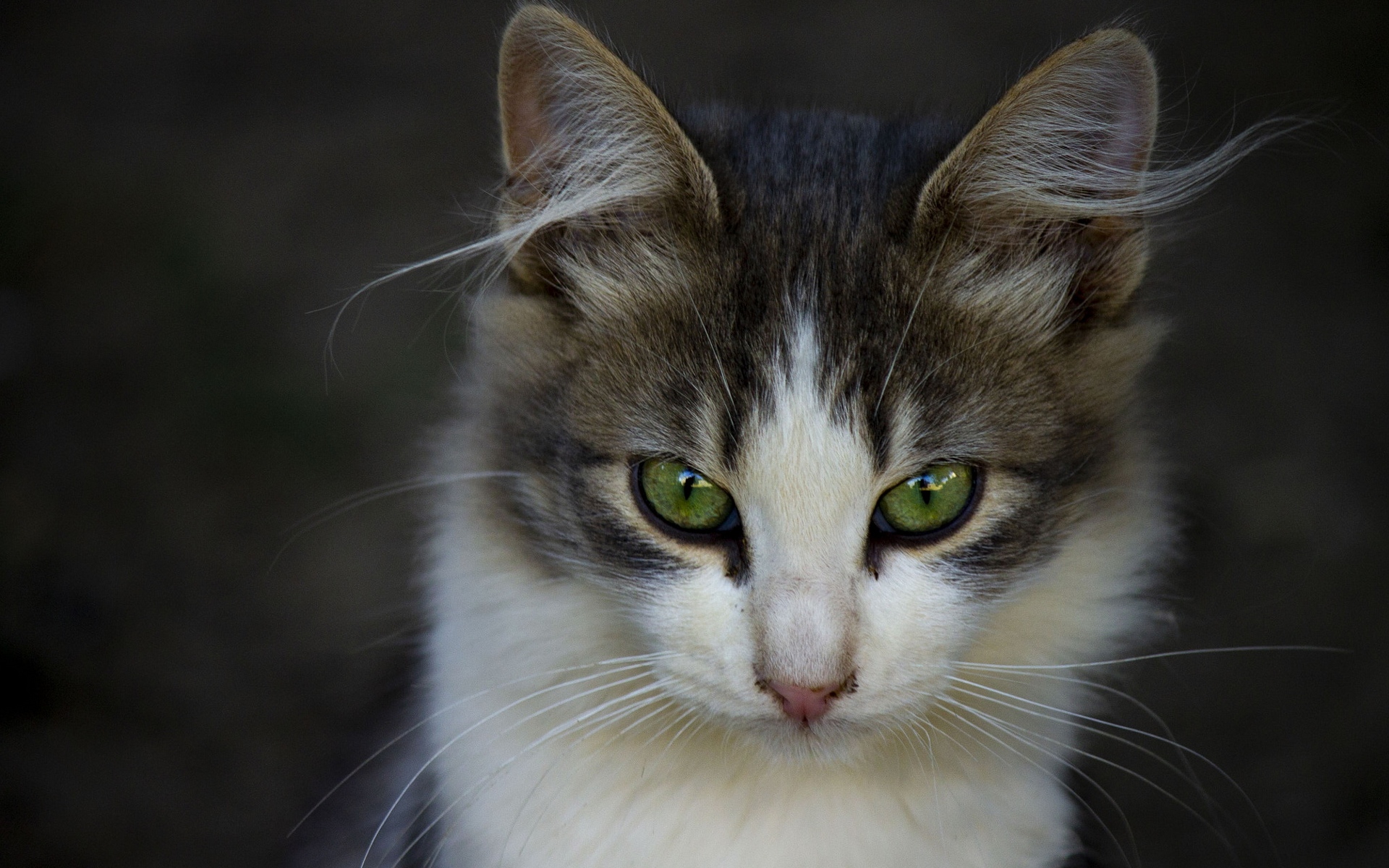 Description: A cat with green eyes looking at the camera with a black background behind it and a blurry background behind it.