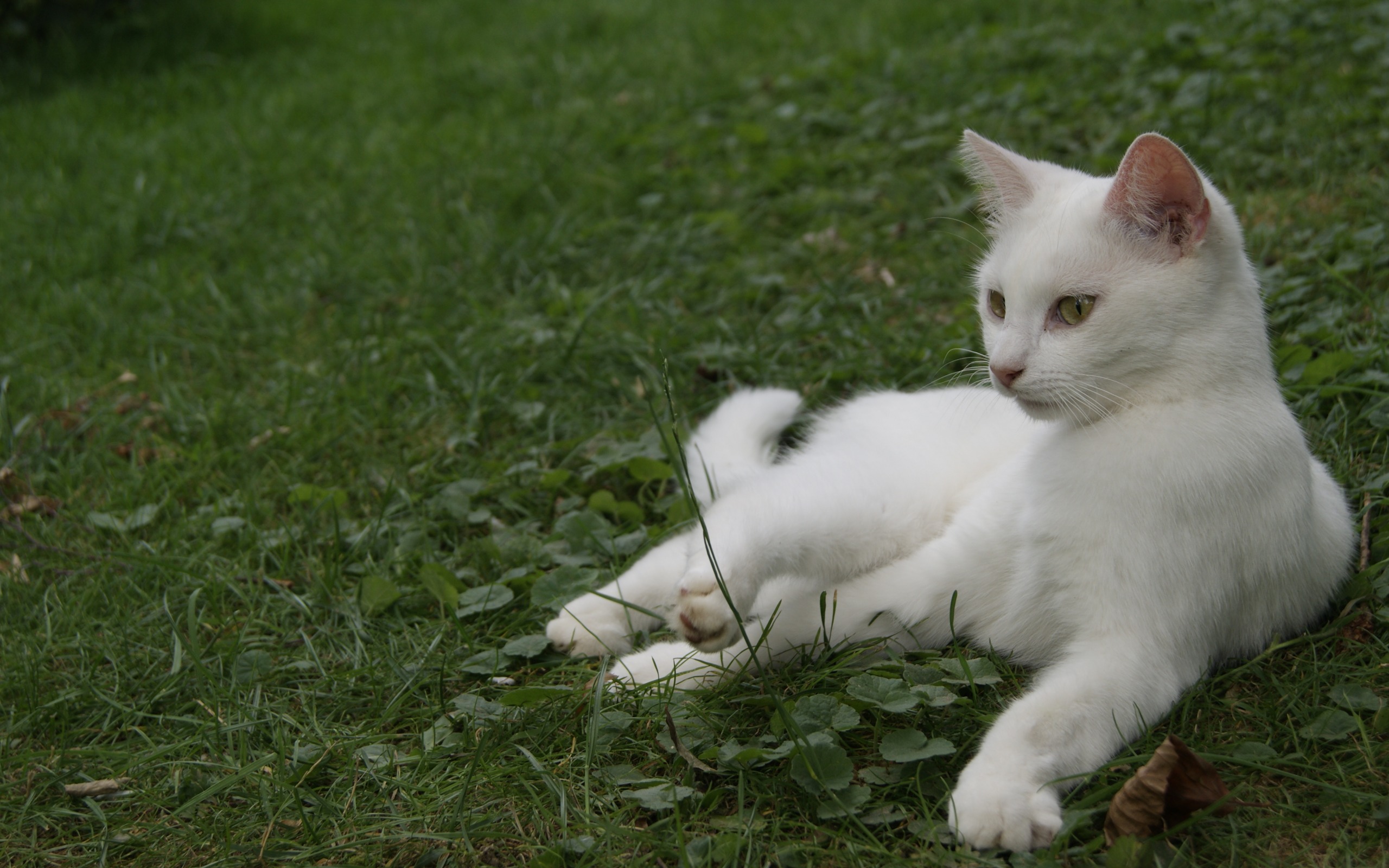 Description: A white cat laying on top of a lush green field of grass next to a bird feeder and a bird.