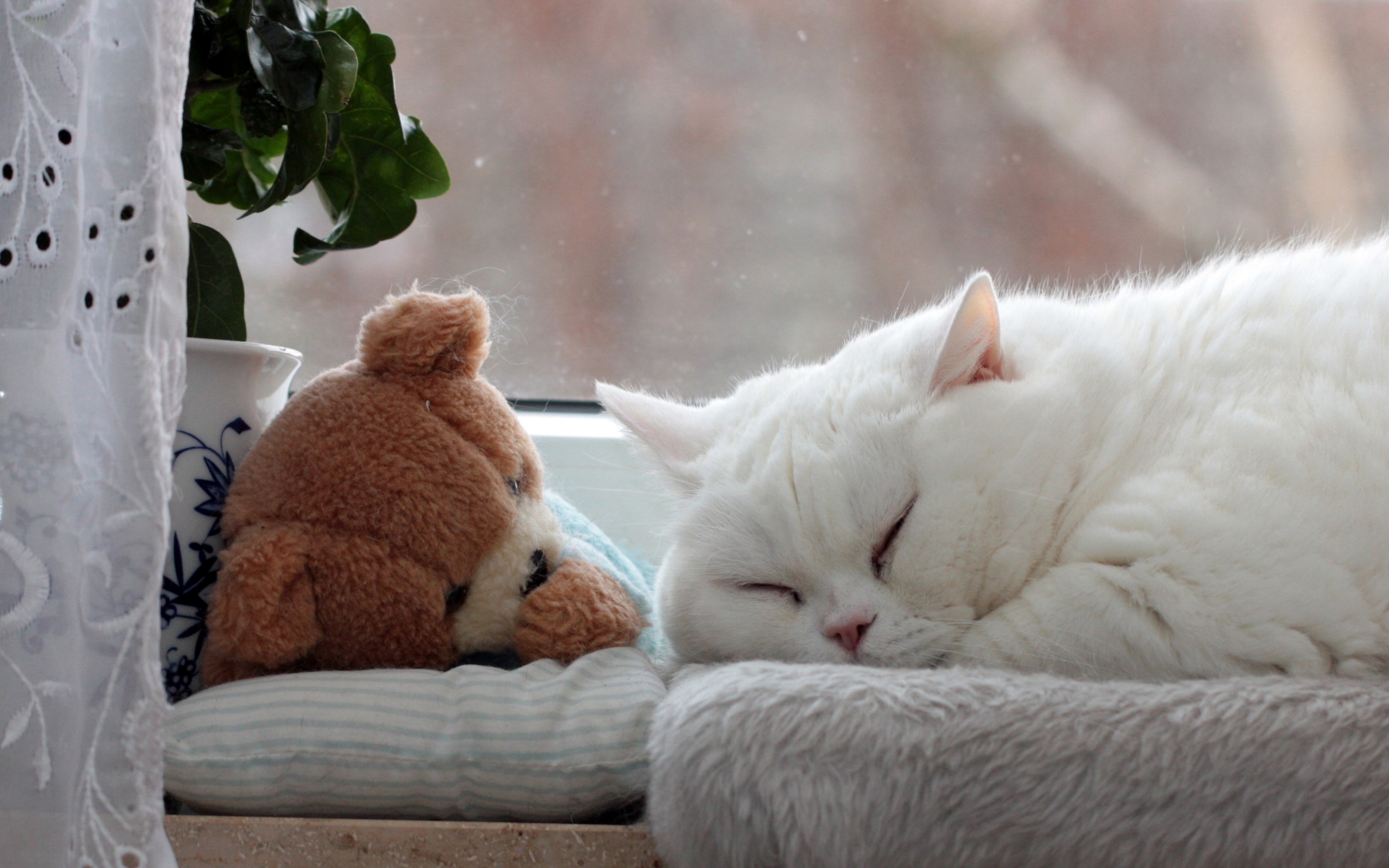 Description: A white cat sleeping next to a teddy bear on a window sill with a teddy bear on the window sill.