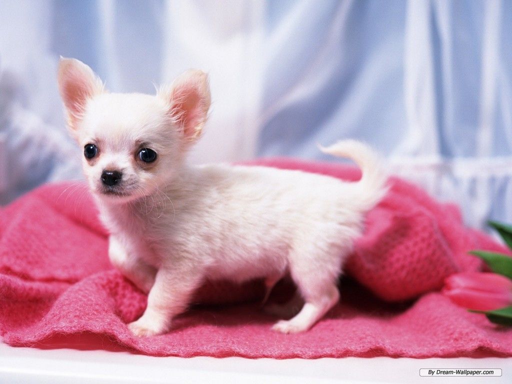 Description: A small white chihuahua puppy standing on a pink blanket with a flower in its mouth and a blue background.