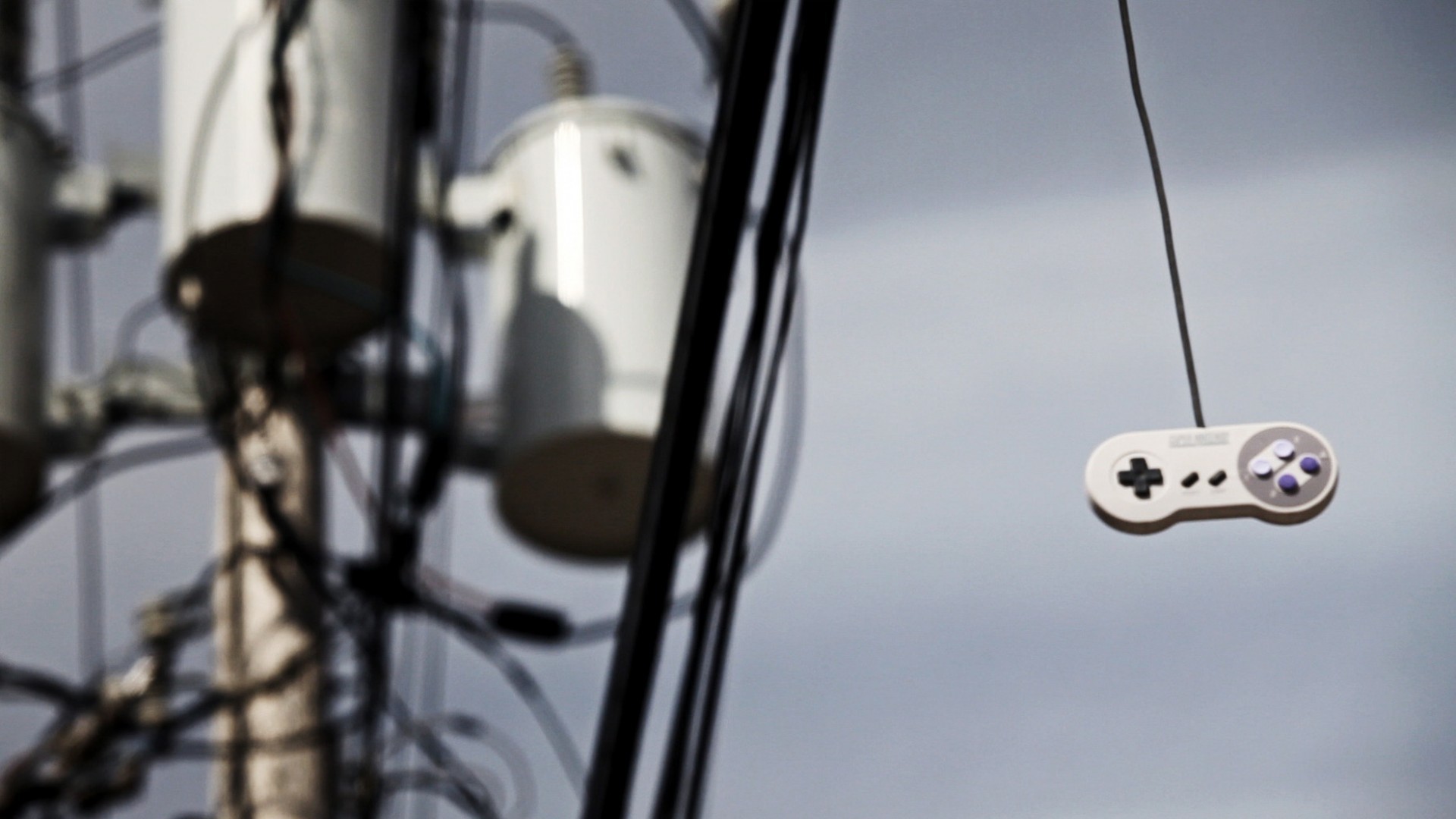 Description: A white controller hanging from a wire with wires in the background and a sky background behind it with clouds.