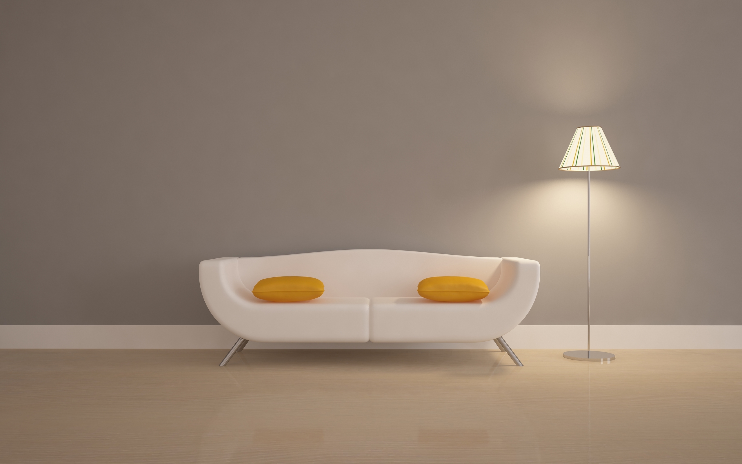 Description: A white couch sitting in a living room next to a lamp on a table and a floor lamp on a stand.