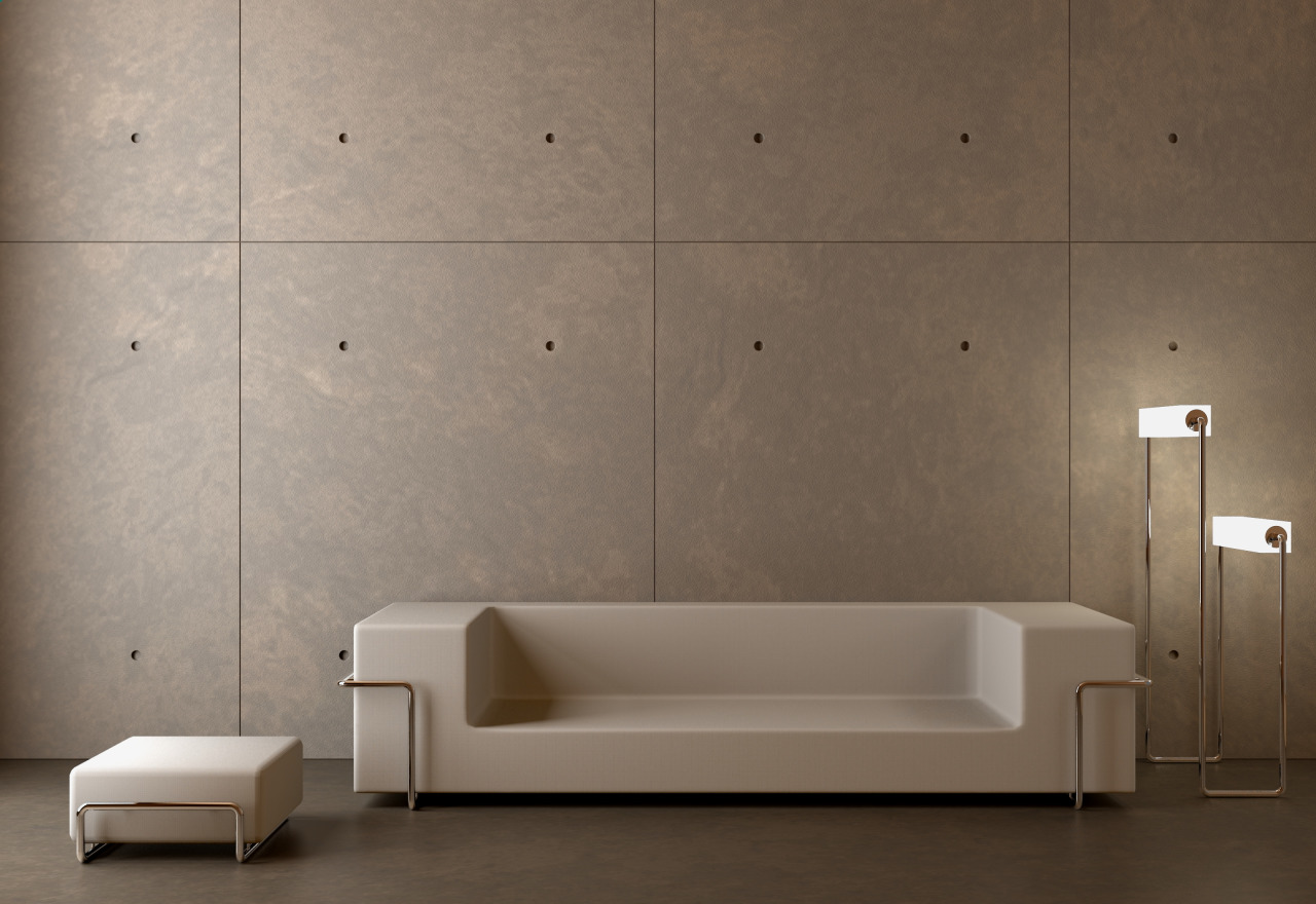 Description: A white couch and a white table in a room with a wall of holes in it and a lamp.