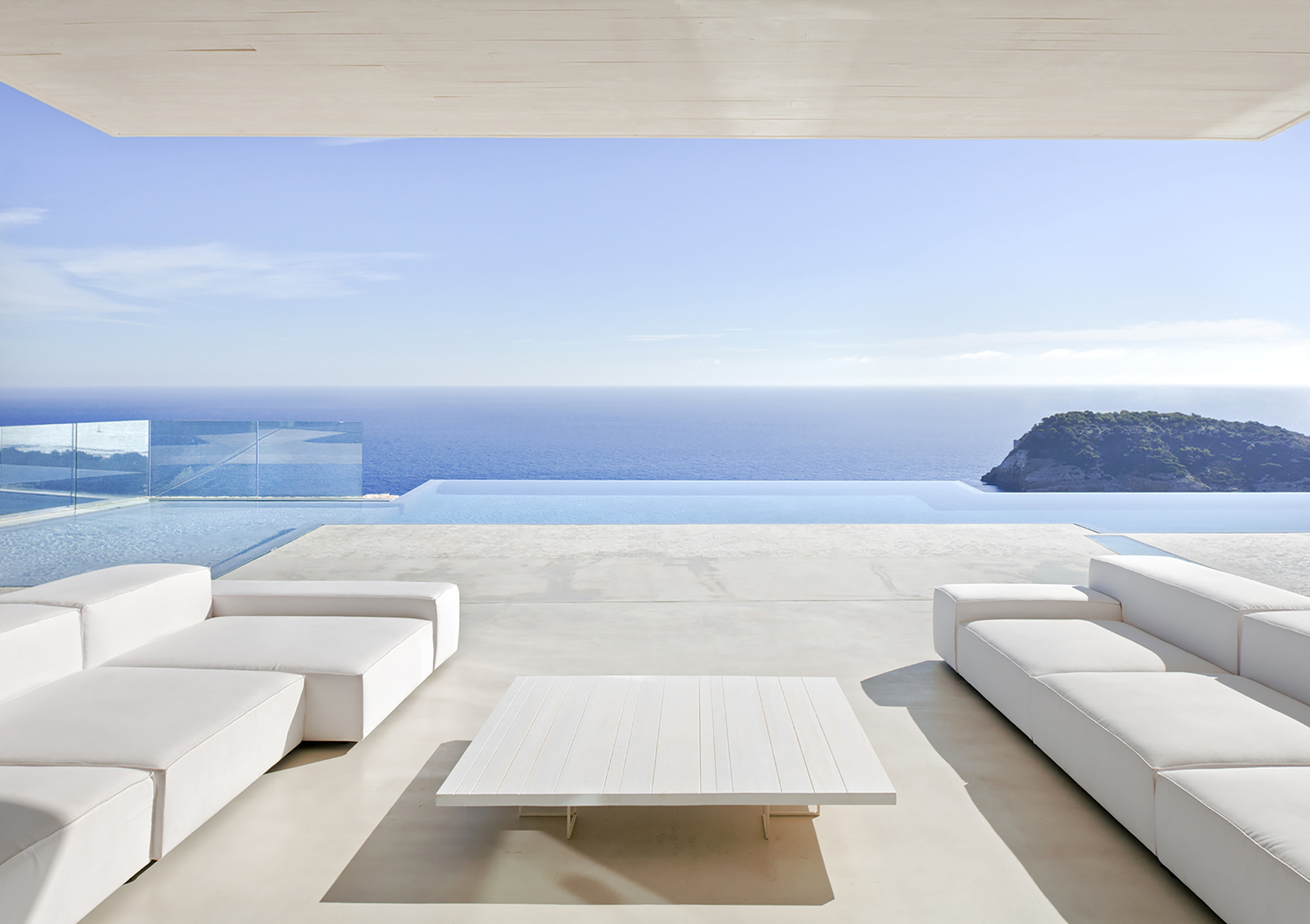 Description: A white couch and table in a room with a view of the ocean and a cliff in the distance.