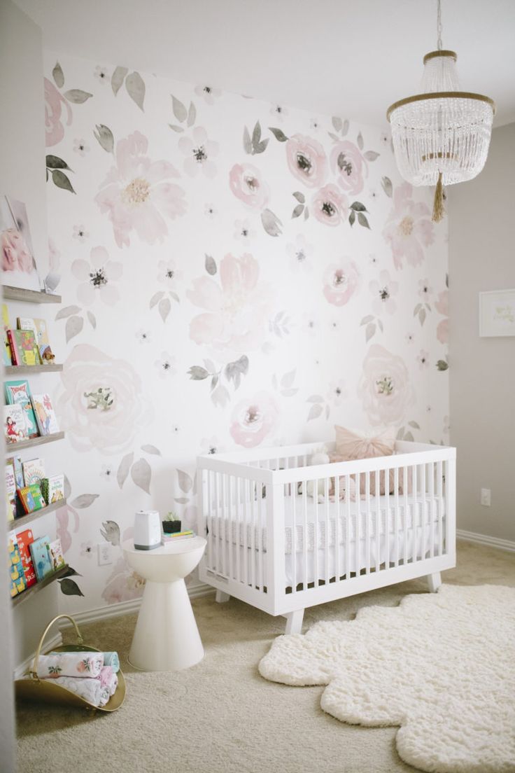 Description: A white crib in a nursery with a flower wallpaper and a white rug on the floor and a white rug on the floor.