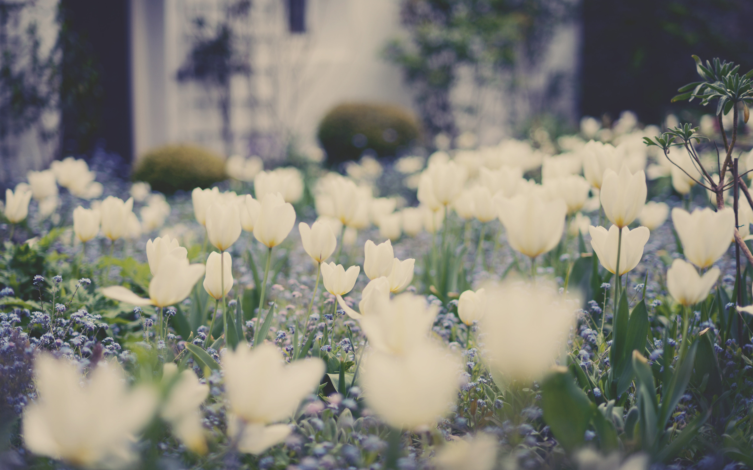 Description: A field of white flowers in front of a house with a house in the background and a few bushes.