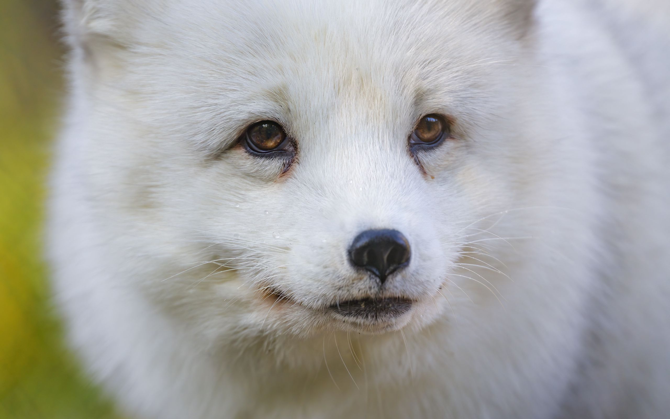 Description: A white dog with a black nose and brown eyes looking at the camera with a blurry background of grass and grass.