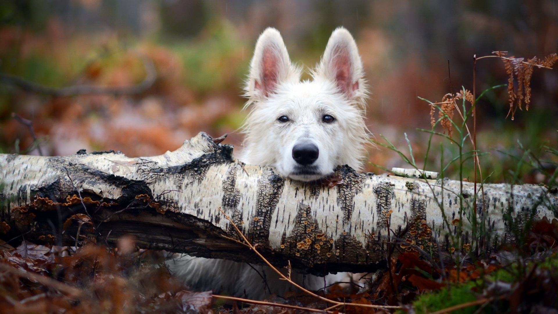 Description: A white dog is chewing on a tree branch in the woods with leaves around it and a fallen tree trunk in the foreground.