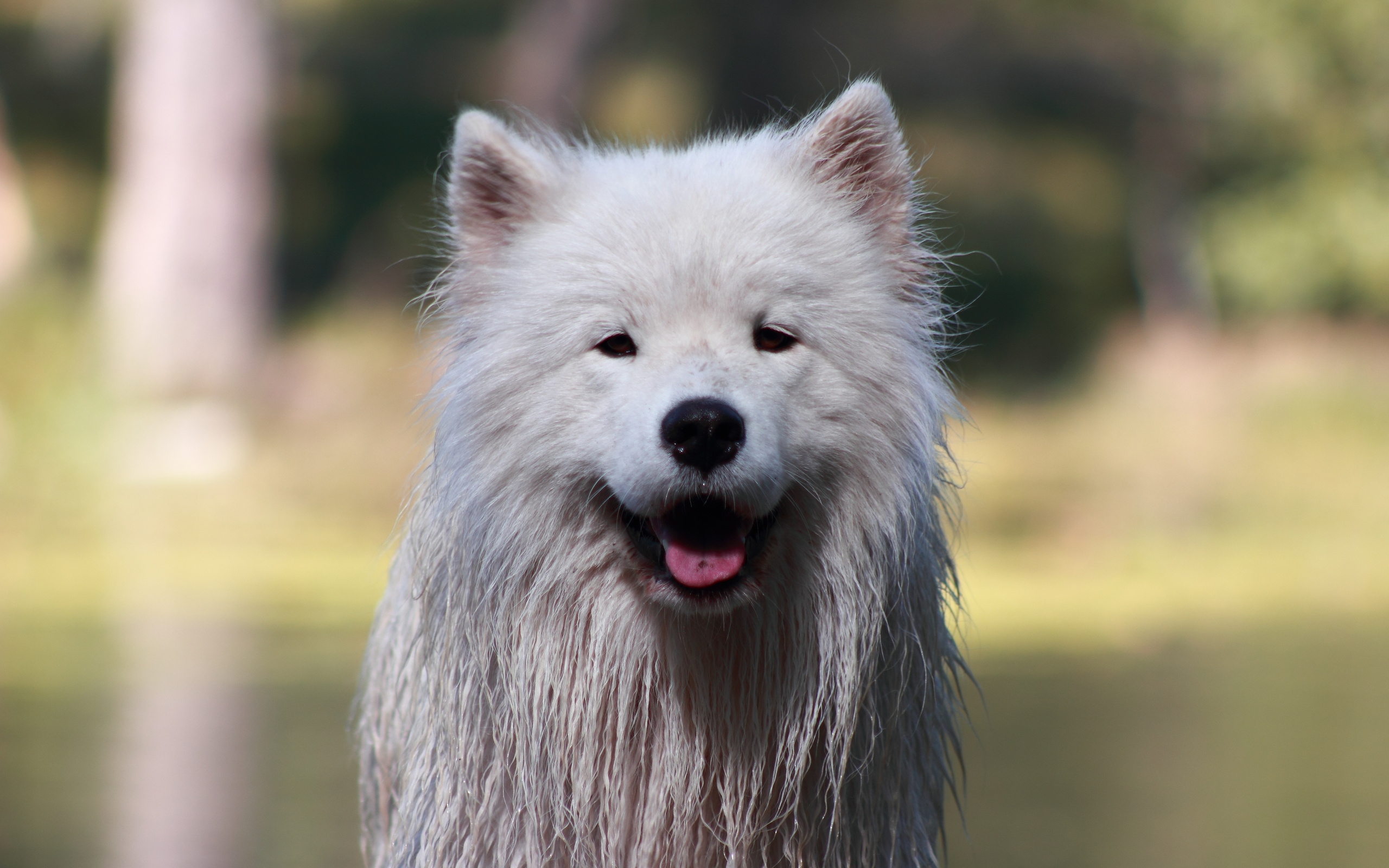 Description: A white dog with long hair standing in front of a lake with trees in the background and a blurry background.