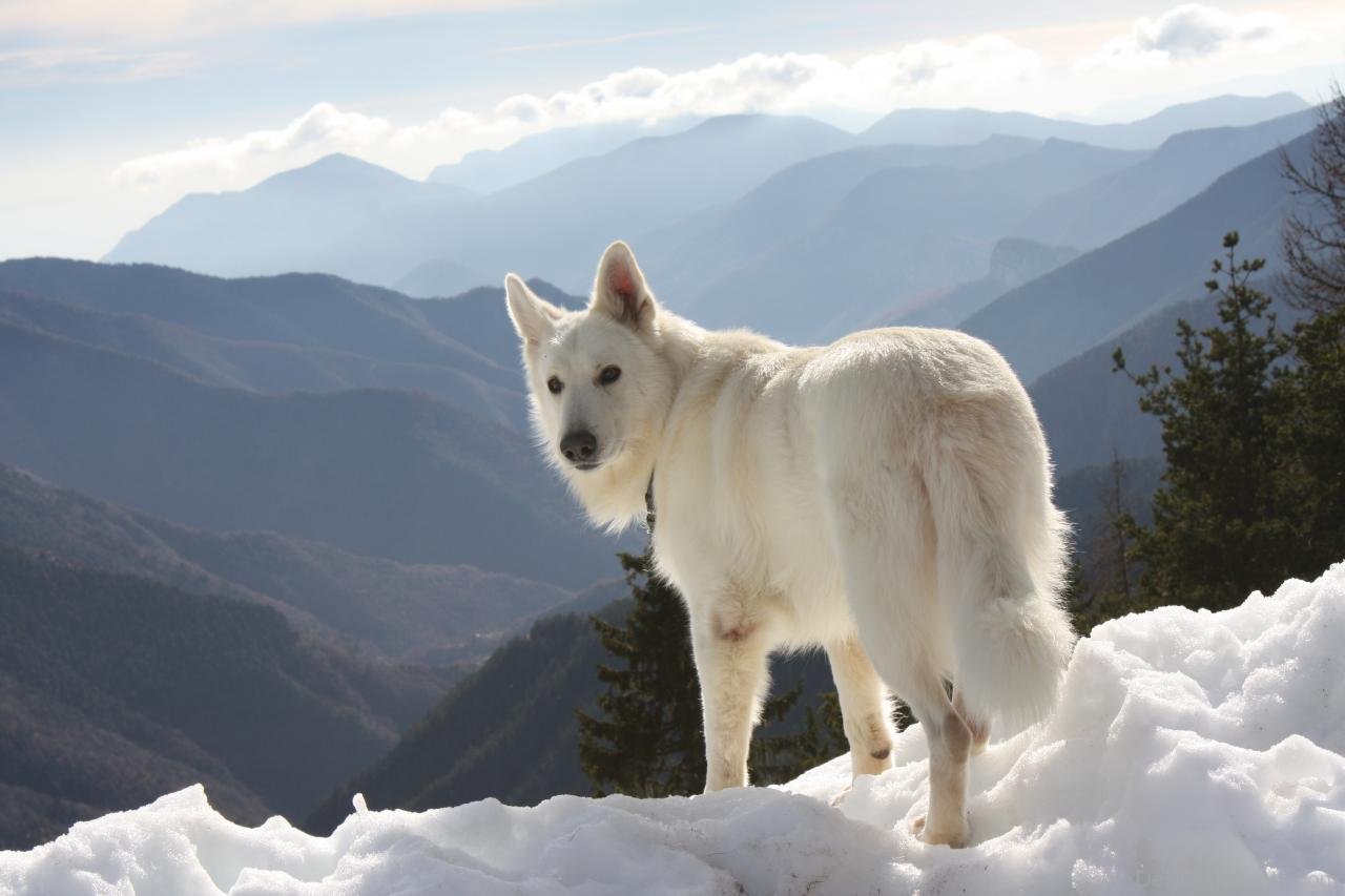 Description: A white dog standing on top of a snow covered slope in the mountains with a view of the mountains.