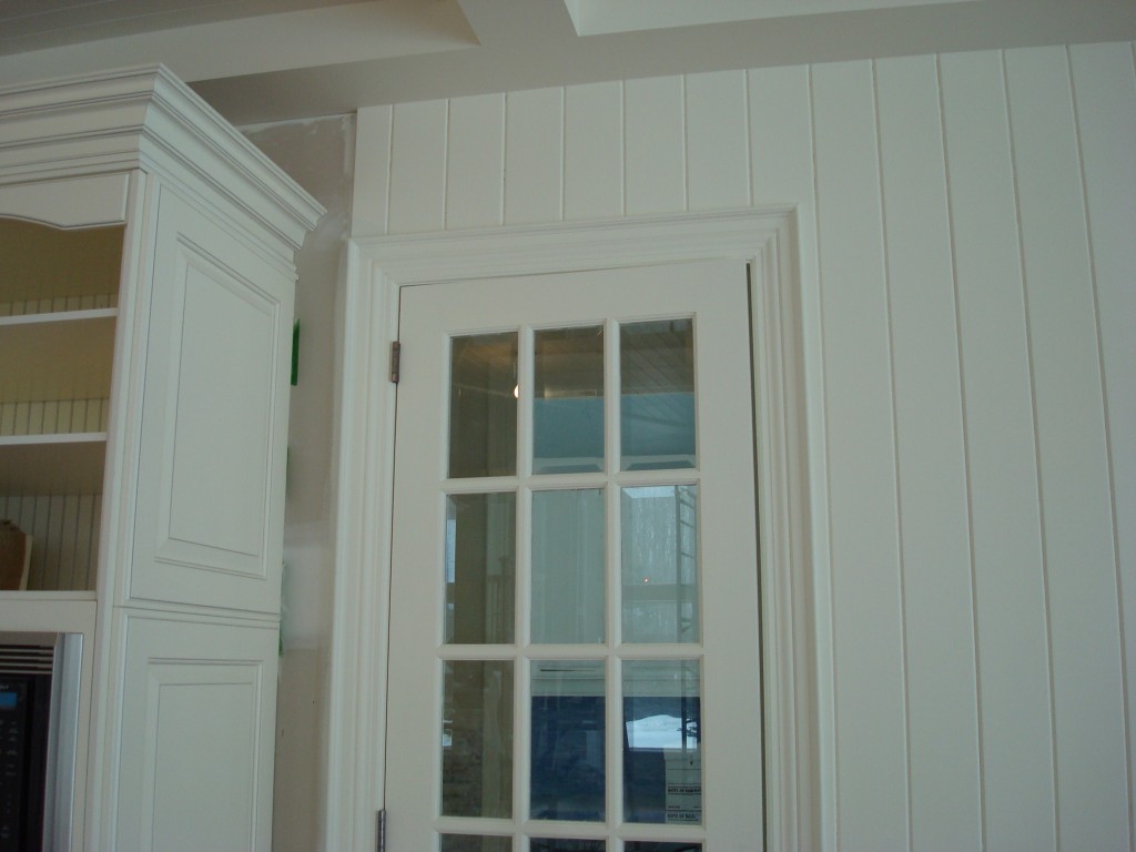 Description: A white door with a glass window in a room with white walls and a white ceiling with a white trim.