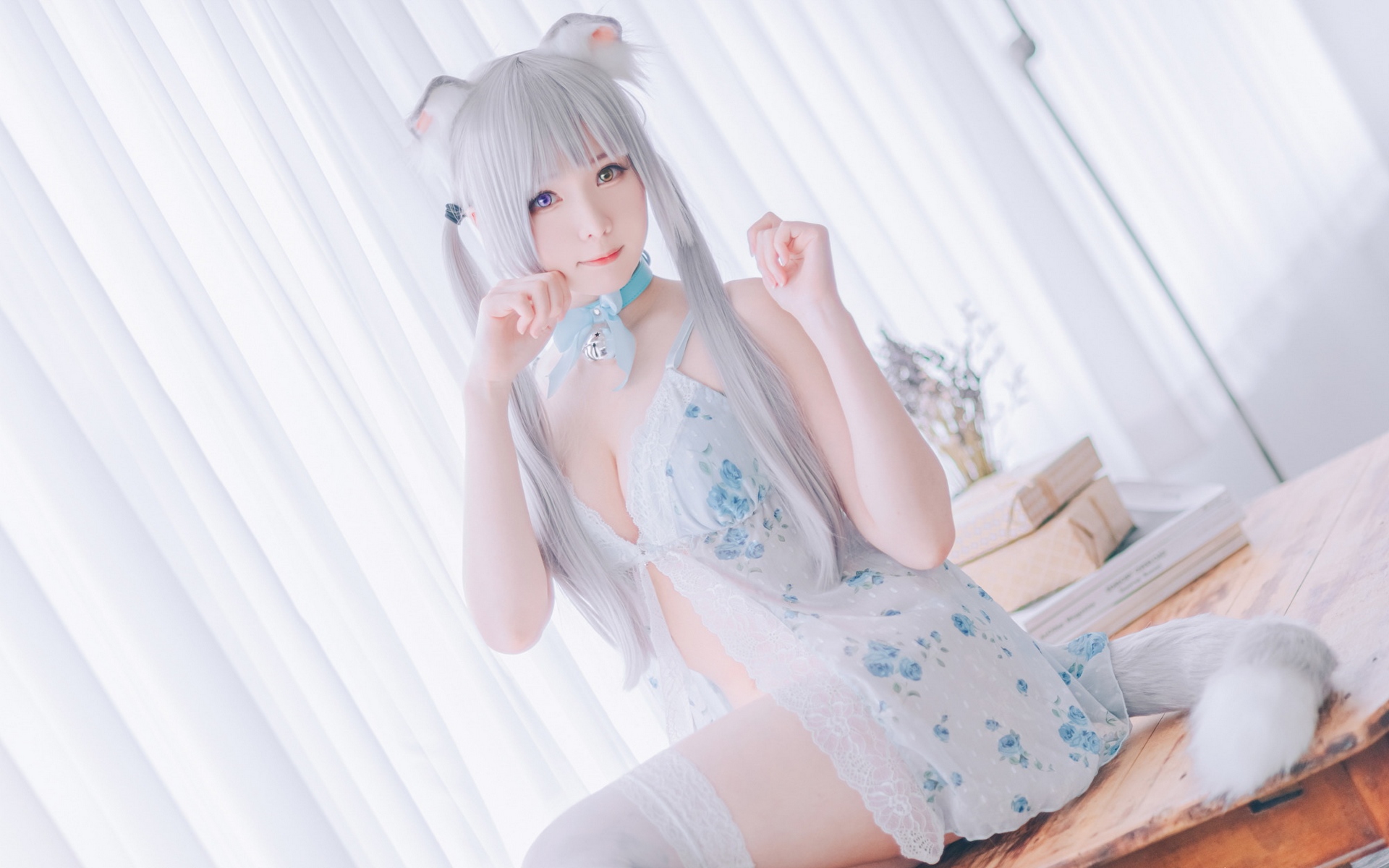Description: A woman in a white dress sitting on a table with a cat ears on her head and a cat tail on her head.