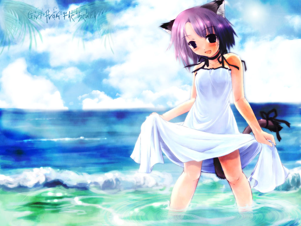 Description: A girl in a white dress standing in the ocean with a cat on her head and a black cat on her shoulder.