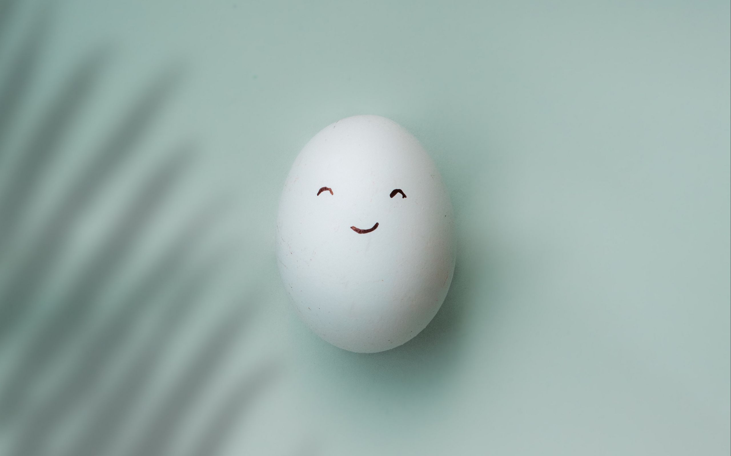 Description: A white egg with a smiley face on a green surface with a shadow of a plant behind it and a shadow of a leaf on the wall.