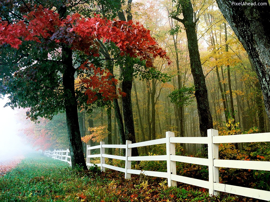 Description: A white fence in a forest with trees and leaves on the ground and fog in the air and a red tree.