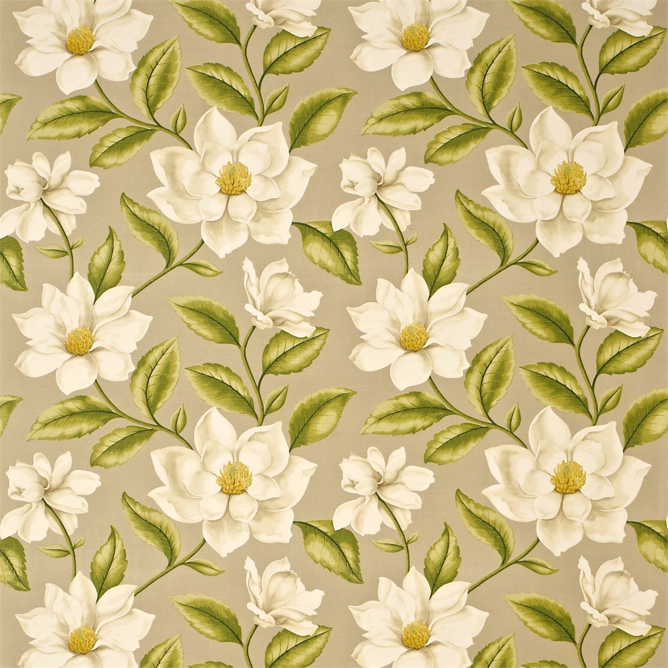Description: A white flower on a beige background with green leaves and buds on it's stem and leaves on the stem.