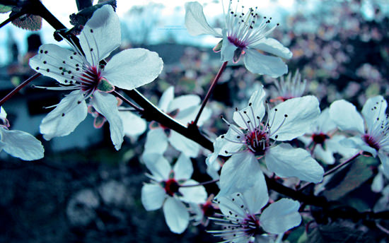 Description: A close up of a tree with white flowers on it's branches and a building in the background.