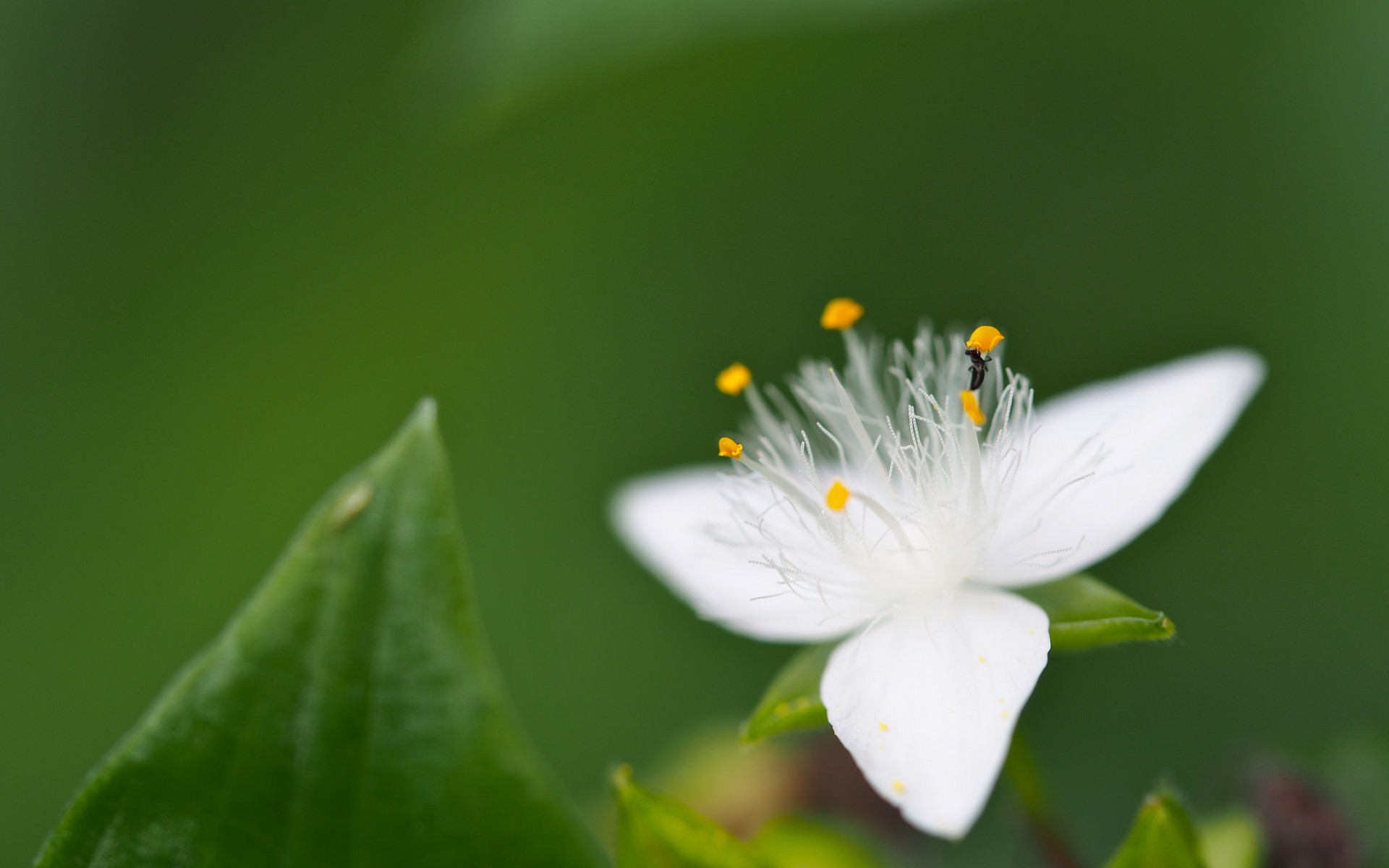 Description: A white flower with yellow stamens on a green leafy background with a blurry background of leaves.
