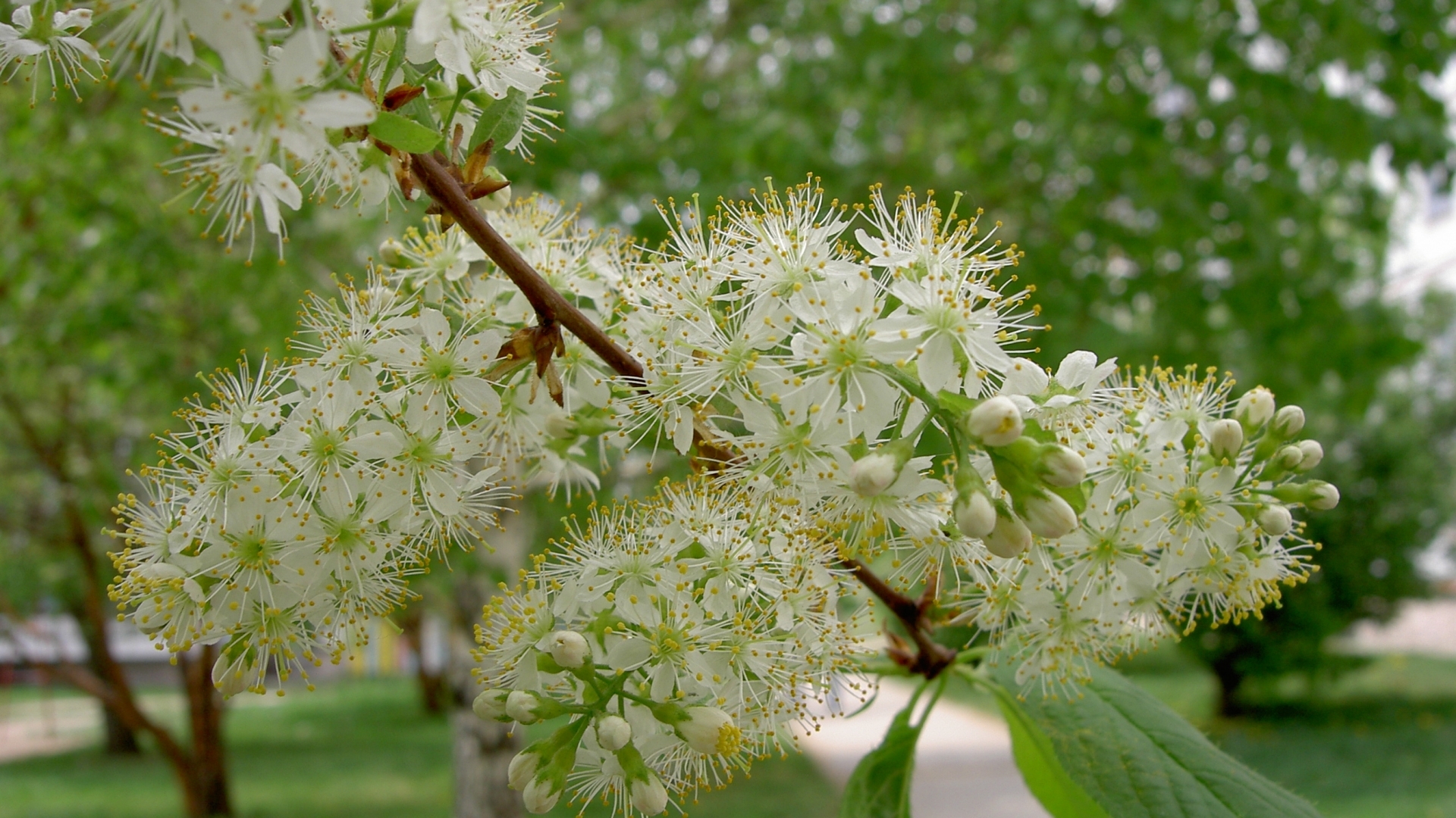 Description: A close up of a tree with white flowers and green leaves in the background and a sidewalk in the foreground.