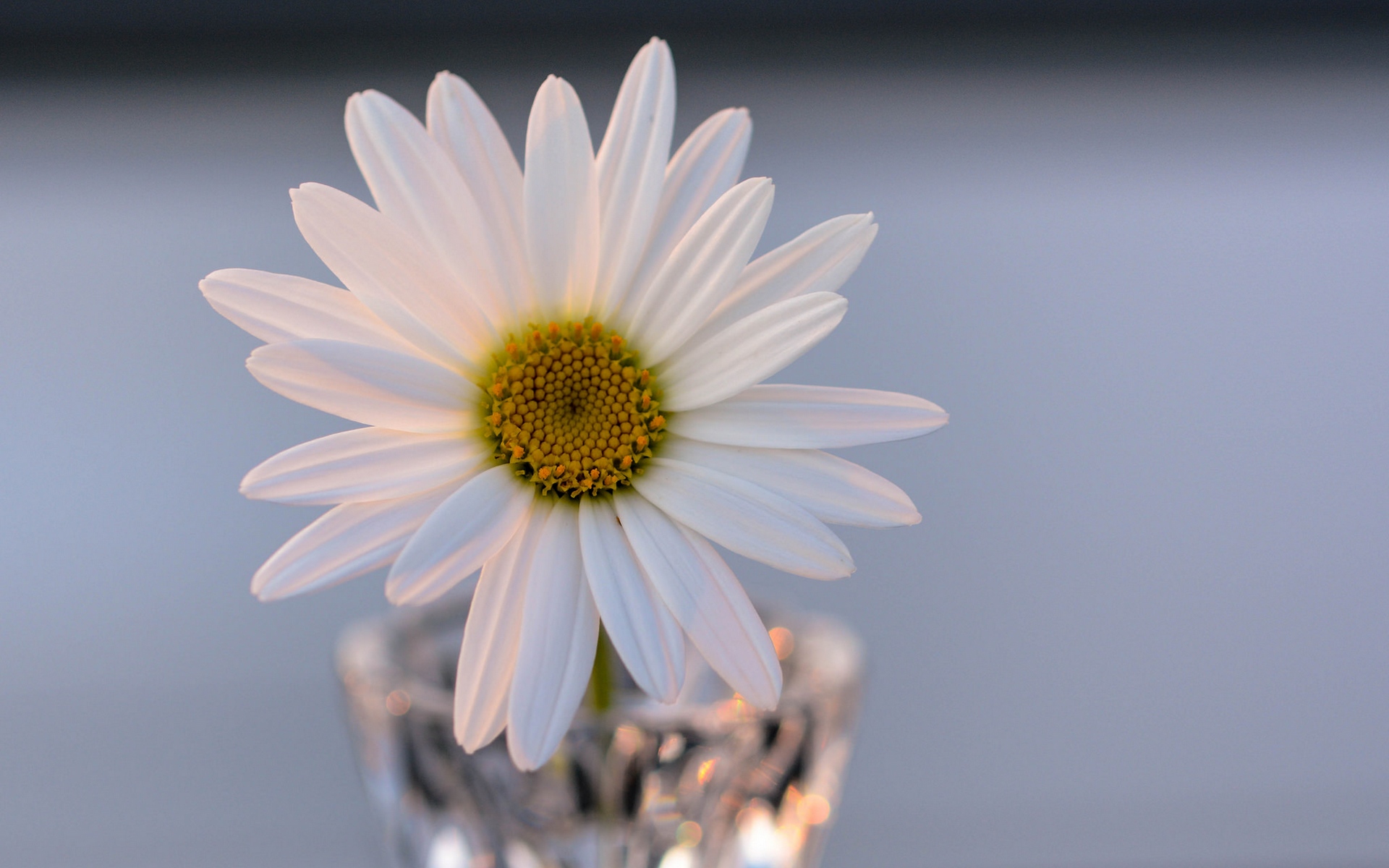 Description: A white flower in a clear glass vase with water in it's bottom half and a light blue background.