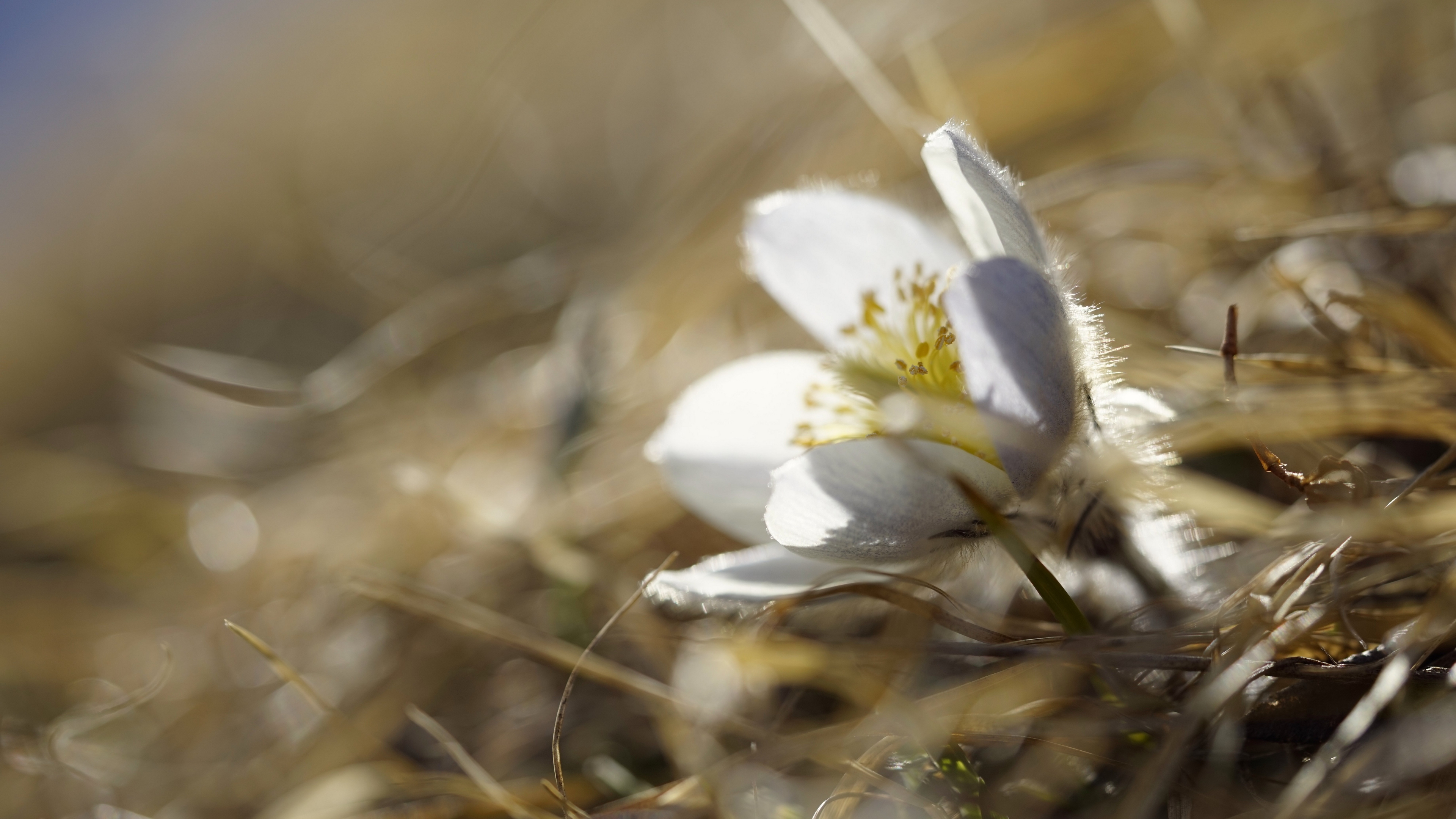 Description: A white flower is in the grass with a blue sky in the background and a few yellow flowers in the foreground.