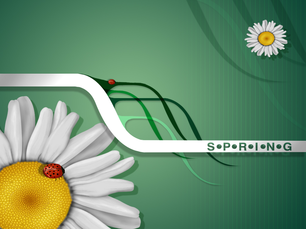 Description: A white flower with a ladybug on it and a green background with a white stripe and a white and yellow flower.
