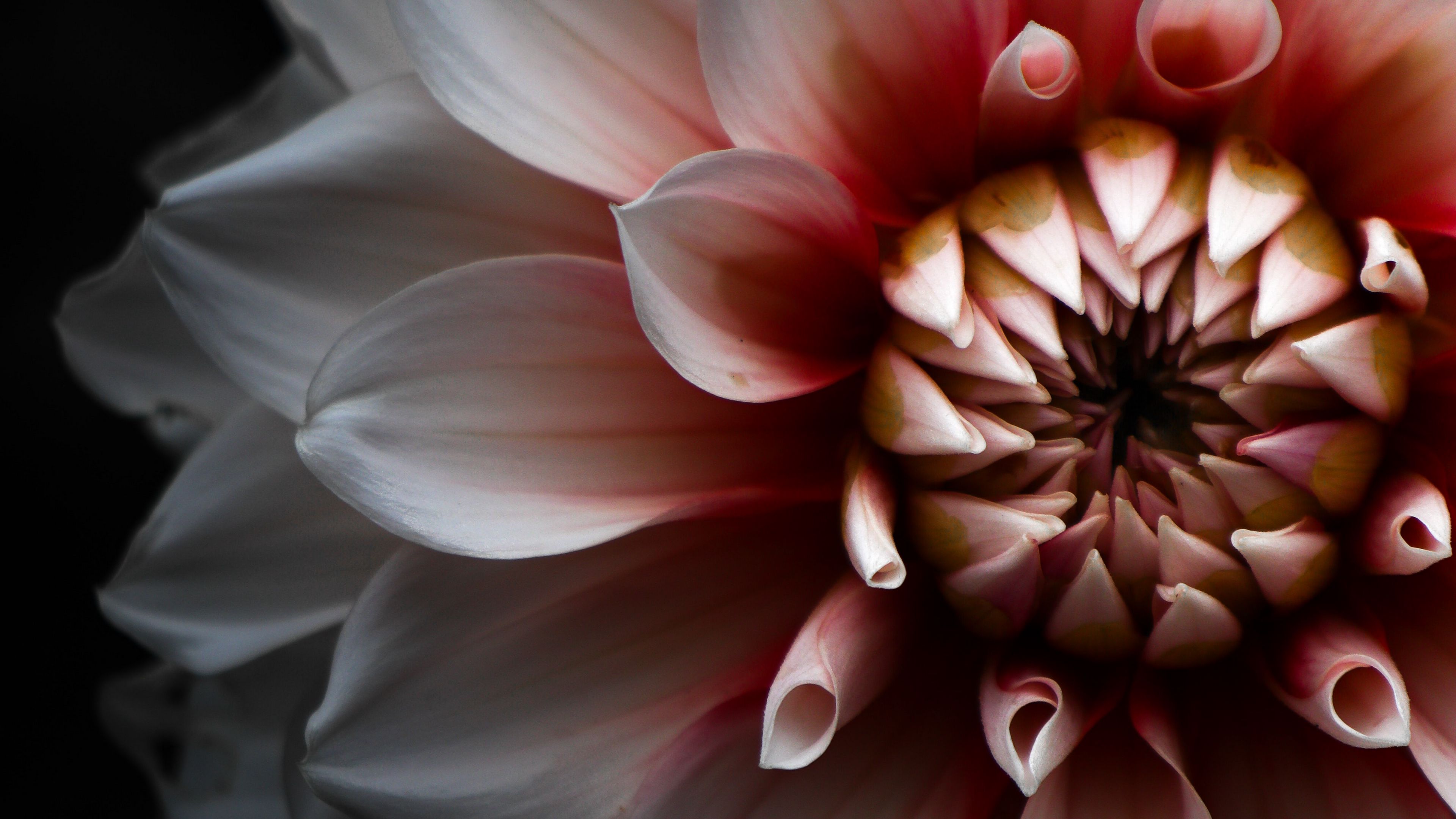 Description: A close up of a flower with a black background and a white flower with a red center and a brown center.