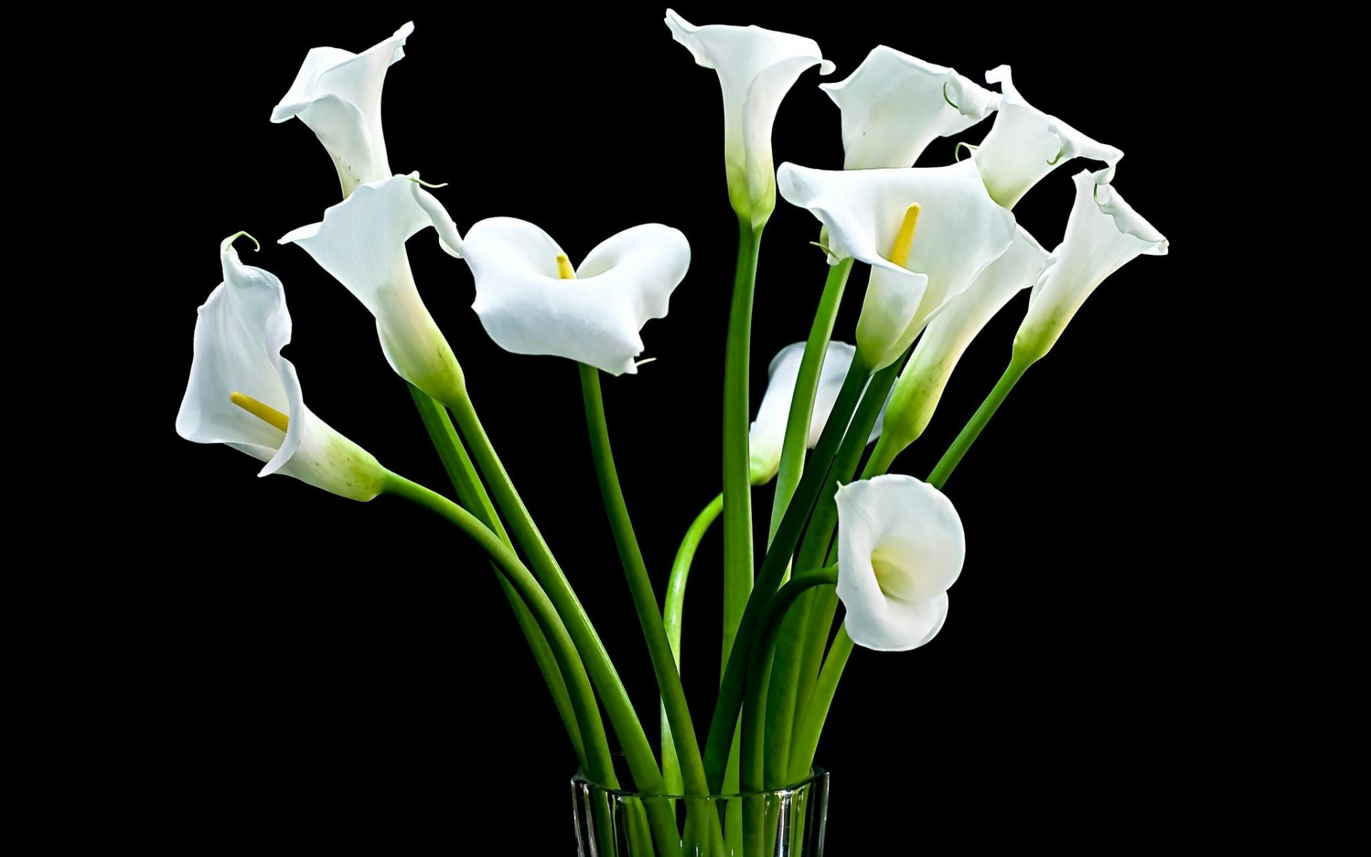 Description: A vase filled with white flowers on top of a table next to a black background with a black background.