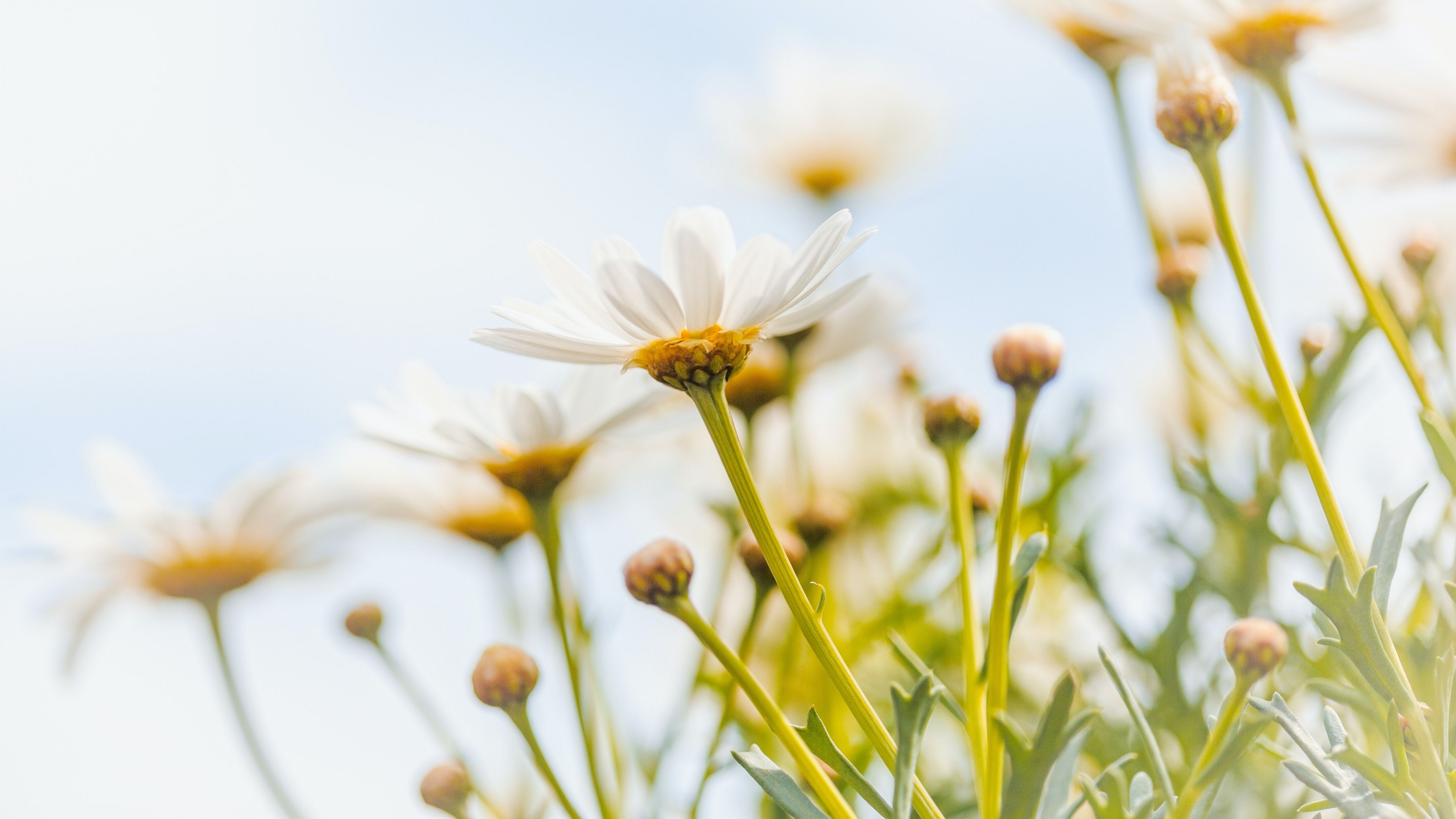 Description: A bunch of white flowers with a sky background behind them and a few yellow centers on the petals of the flowers.
