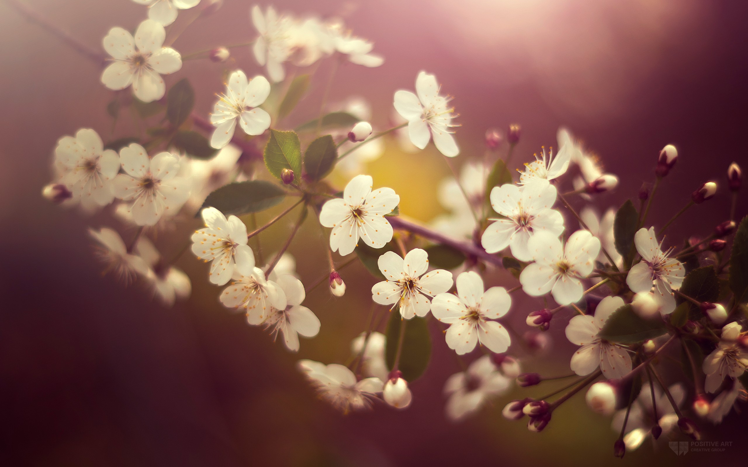 Description: A close up of a bunch of white flowers on a tree branch with a blurry background of the flowers.