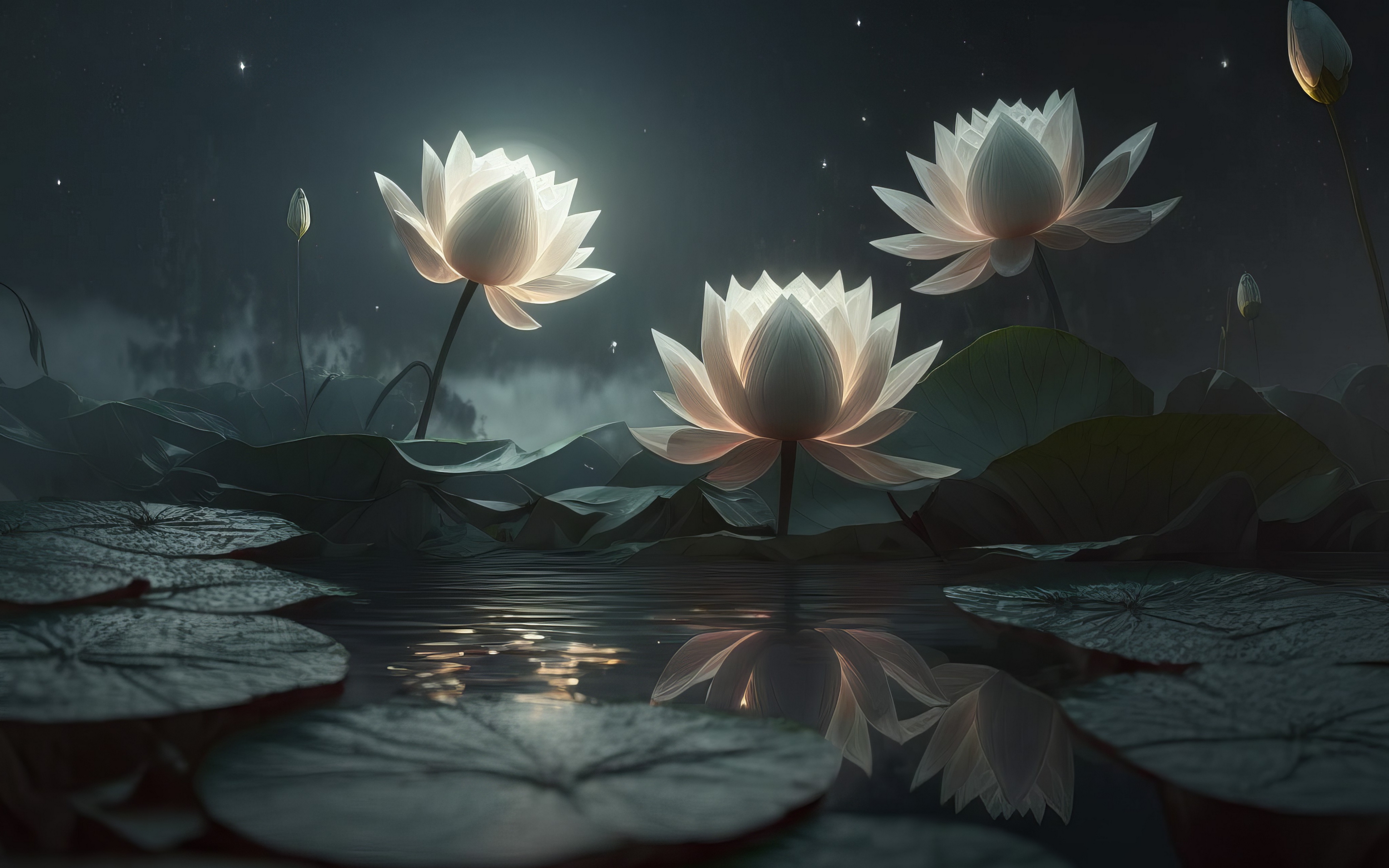 Description: A group of white flowers floating on top of a lake next to lily pads and a moon in the sky.