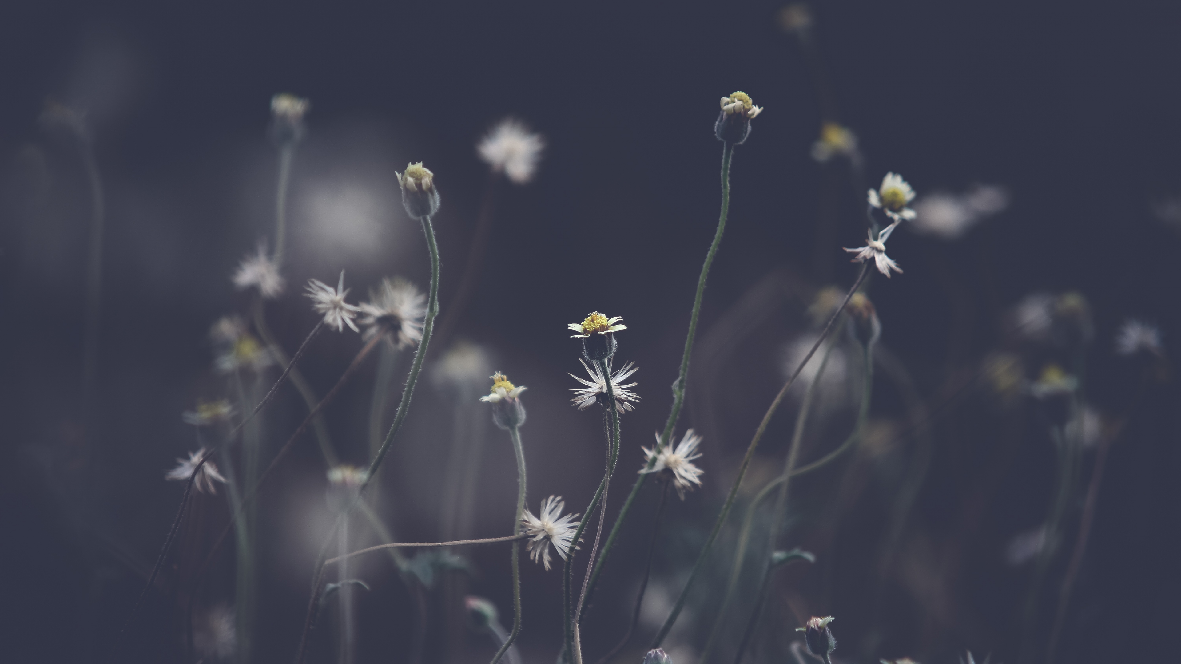Description: A bunch of white flowers with yellow centers on a dark background with a blurry background of the flowers.