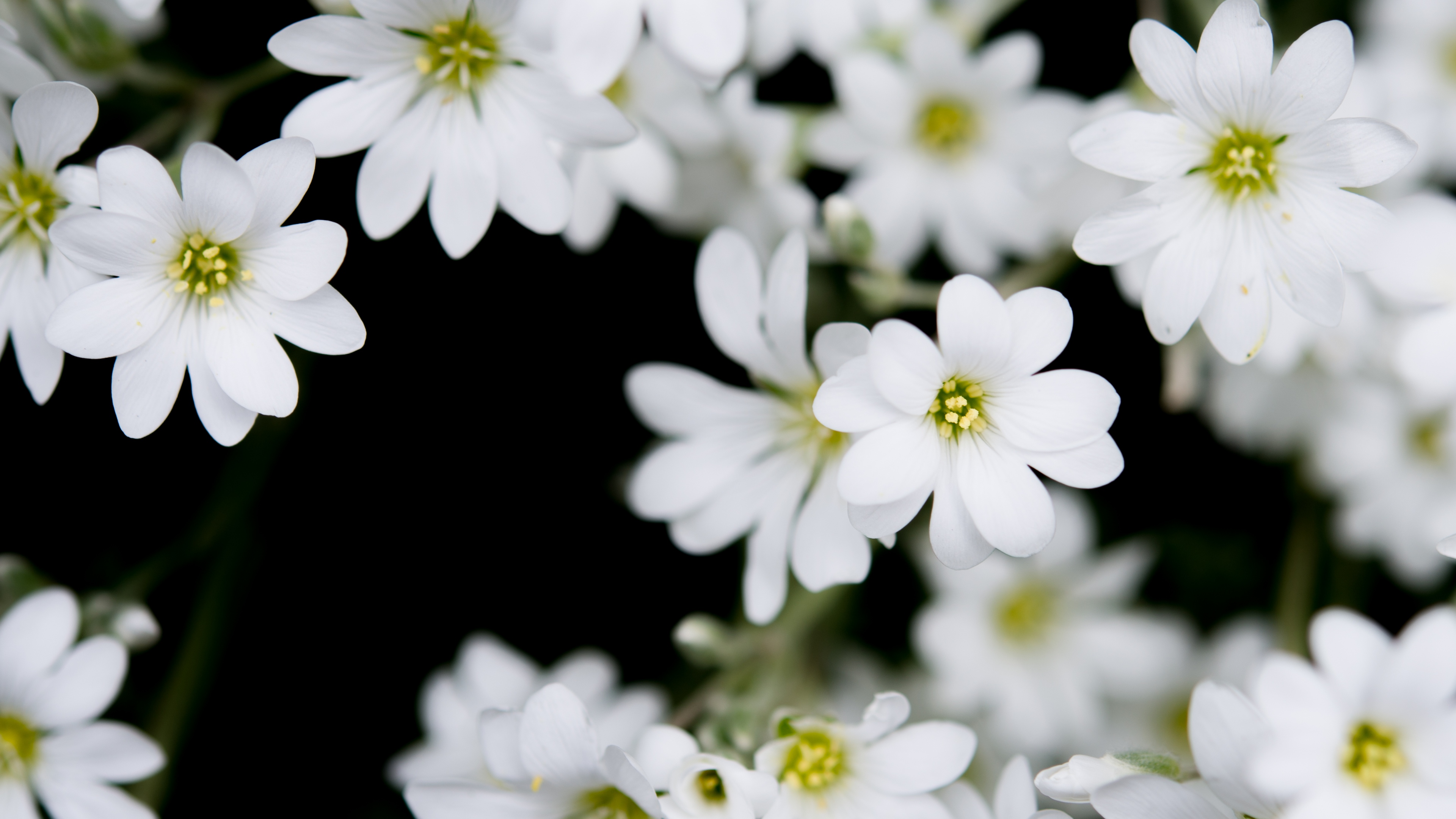 Description: A bunch of white flowers with yellow centers on a black background with a black background and a white background.