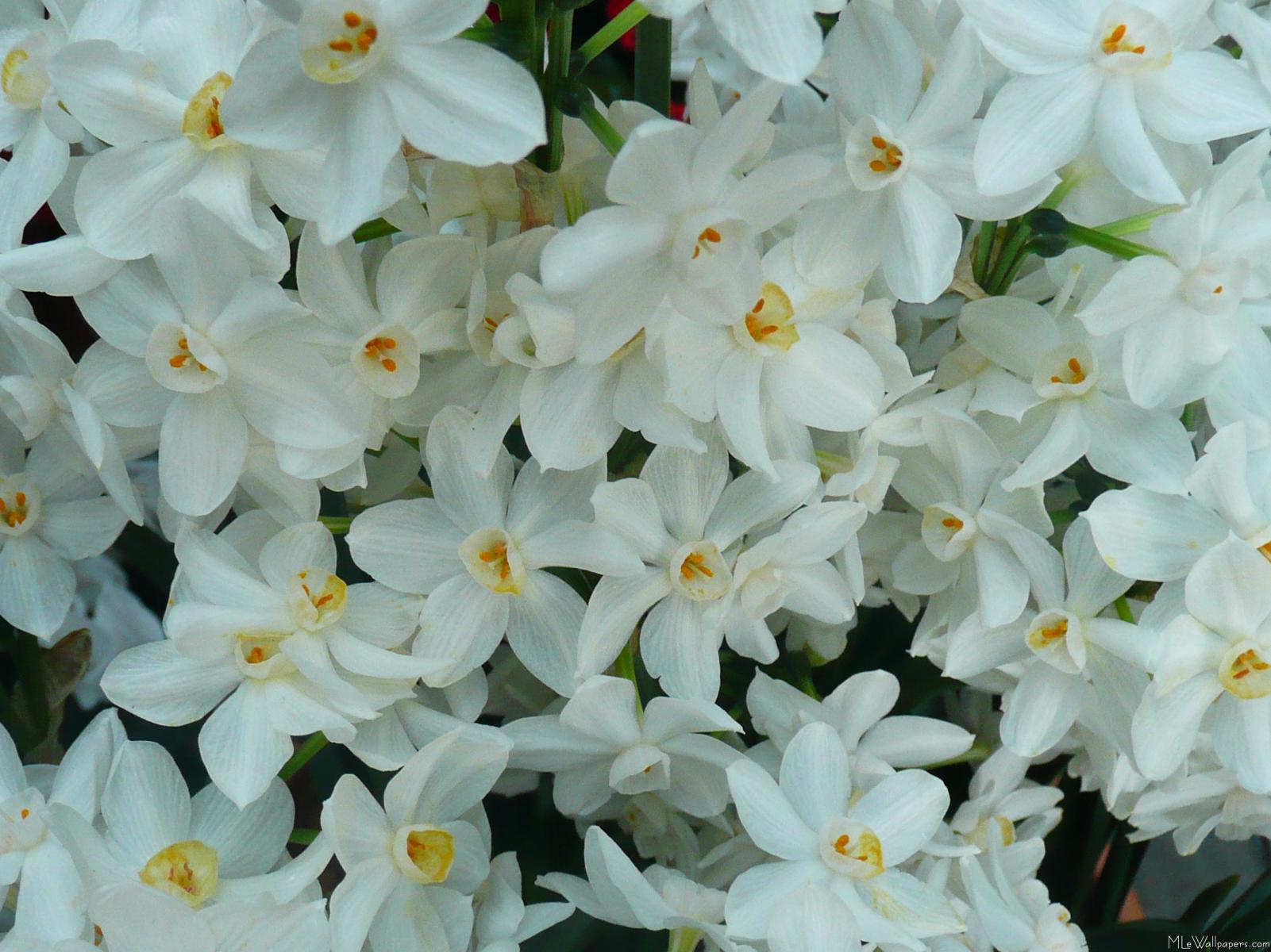 Description: A bunch of white flowers with yellow centers in a vase on a table top or table top.