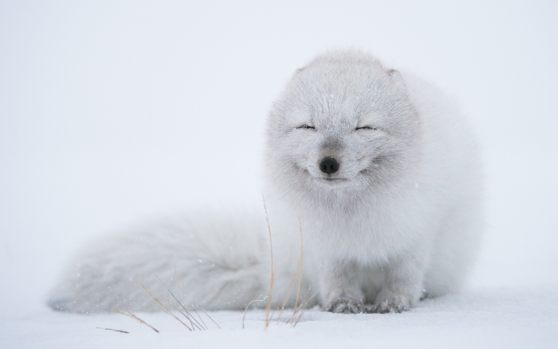 Description: A white fox with its eyes closed and eyes closed in the snow.