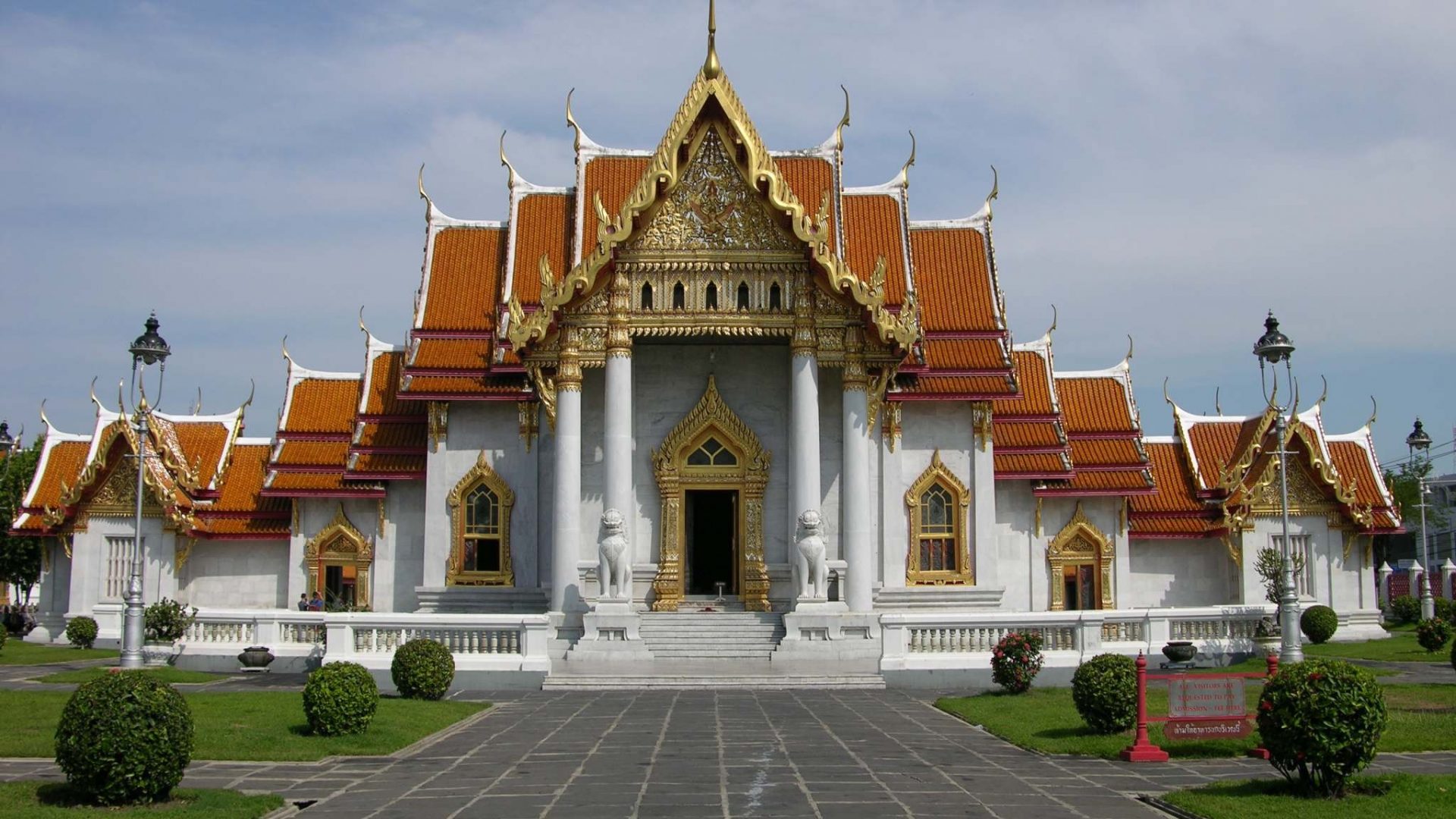 Description: A white and gold building with a red door and a red bench in front of it and a red and white sign.