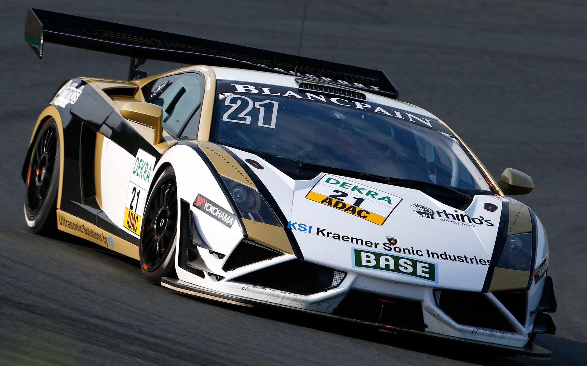 Description: A white and gold race car driving on a track with a number on the side of it's car.