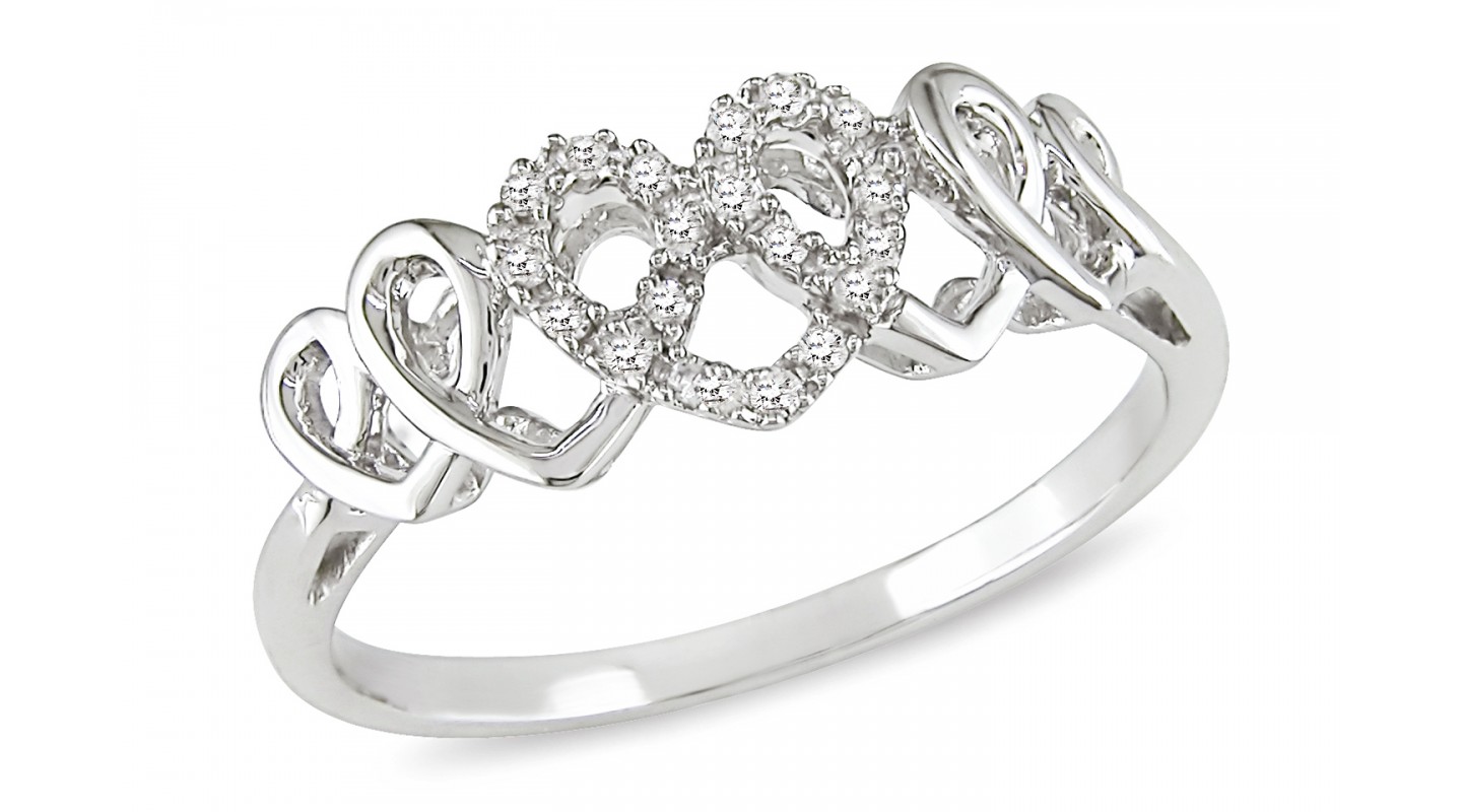Description: A white gold ring with three hearts and a diamond center on the band.