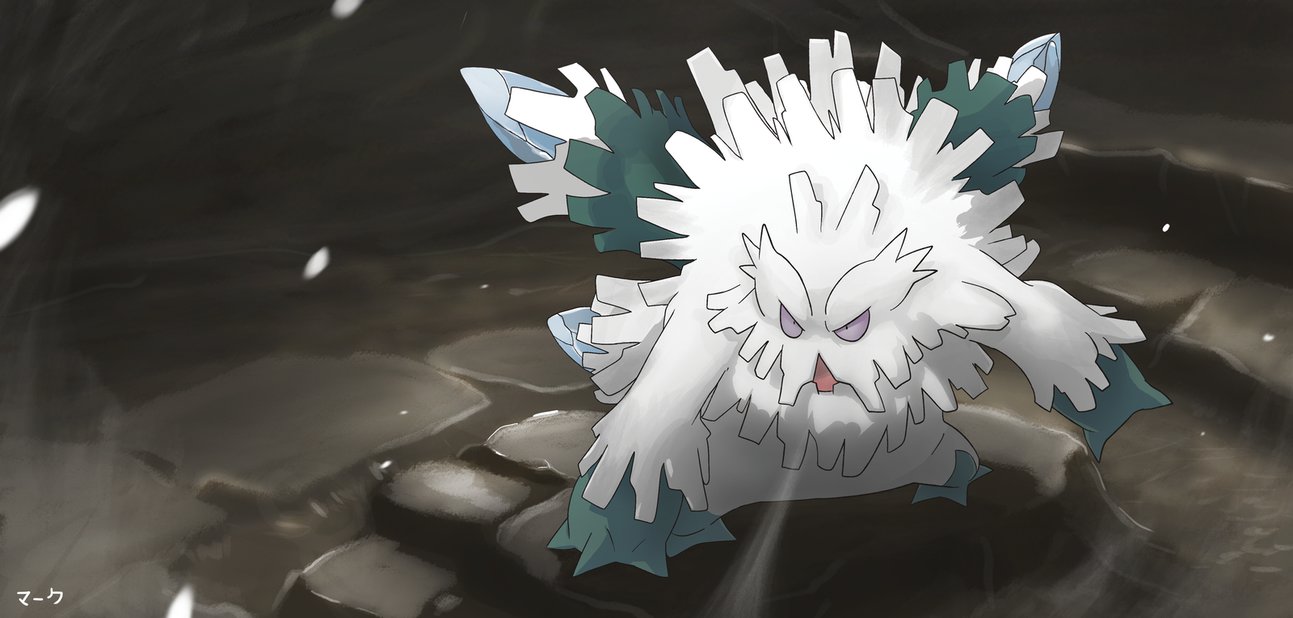 Description: A white and green pokemon character standing in a puddle of water with its eyes closed and one eye partially closed.