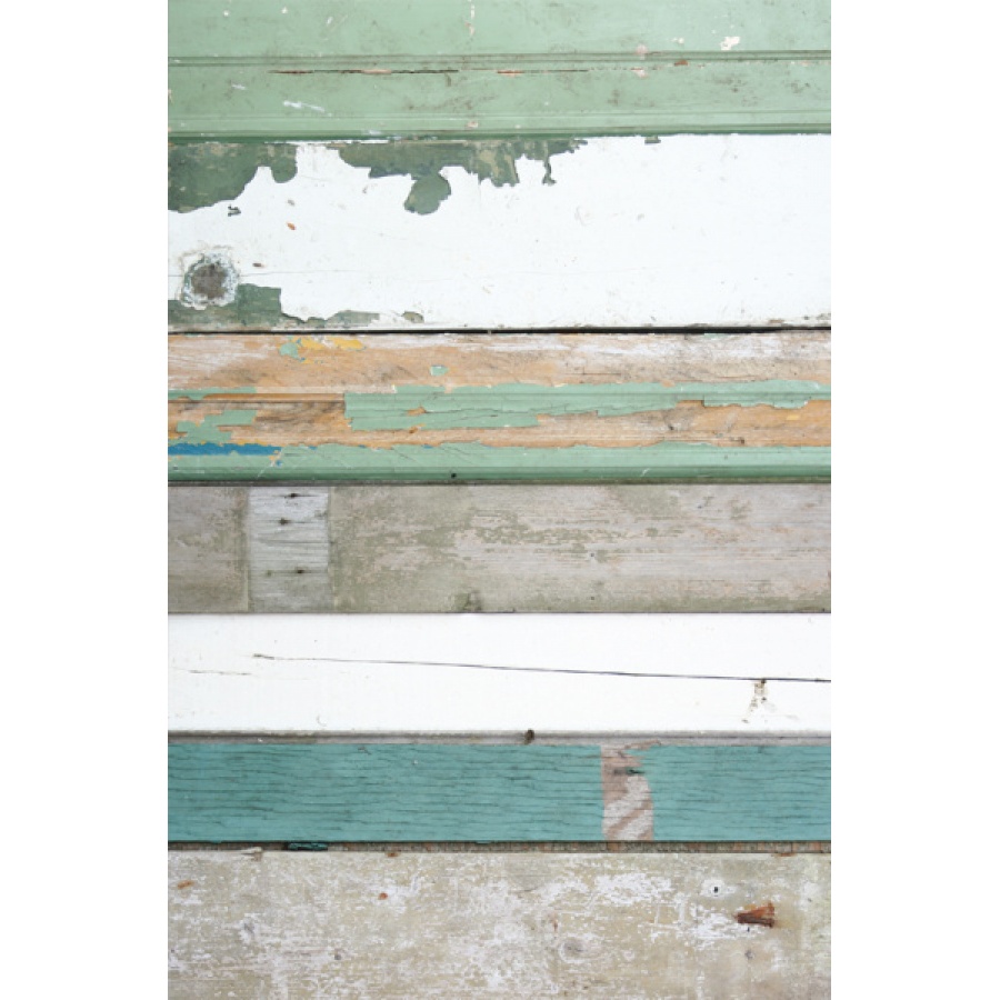 Description: A white and green wall with peeling paint on it and a white and green door with a white handle.