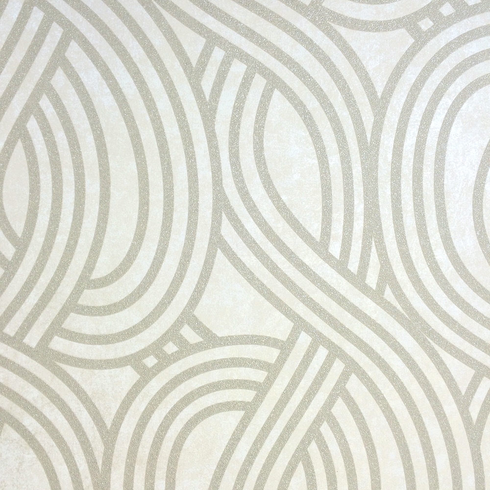 Description: A white and grey wallpaper with a design on it's surface and a white vase with a flower in it.