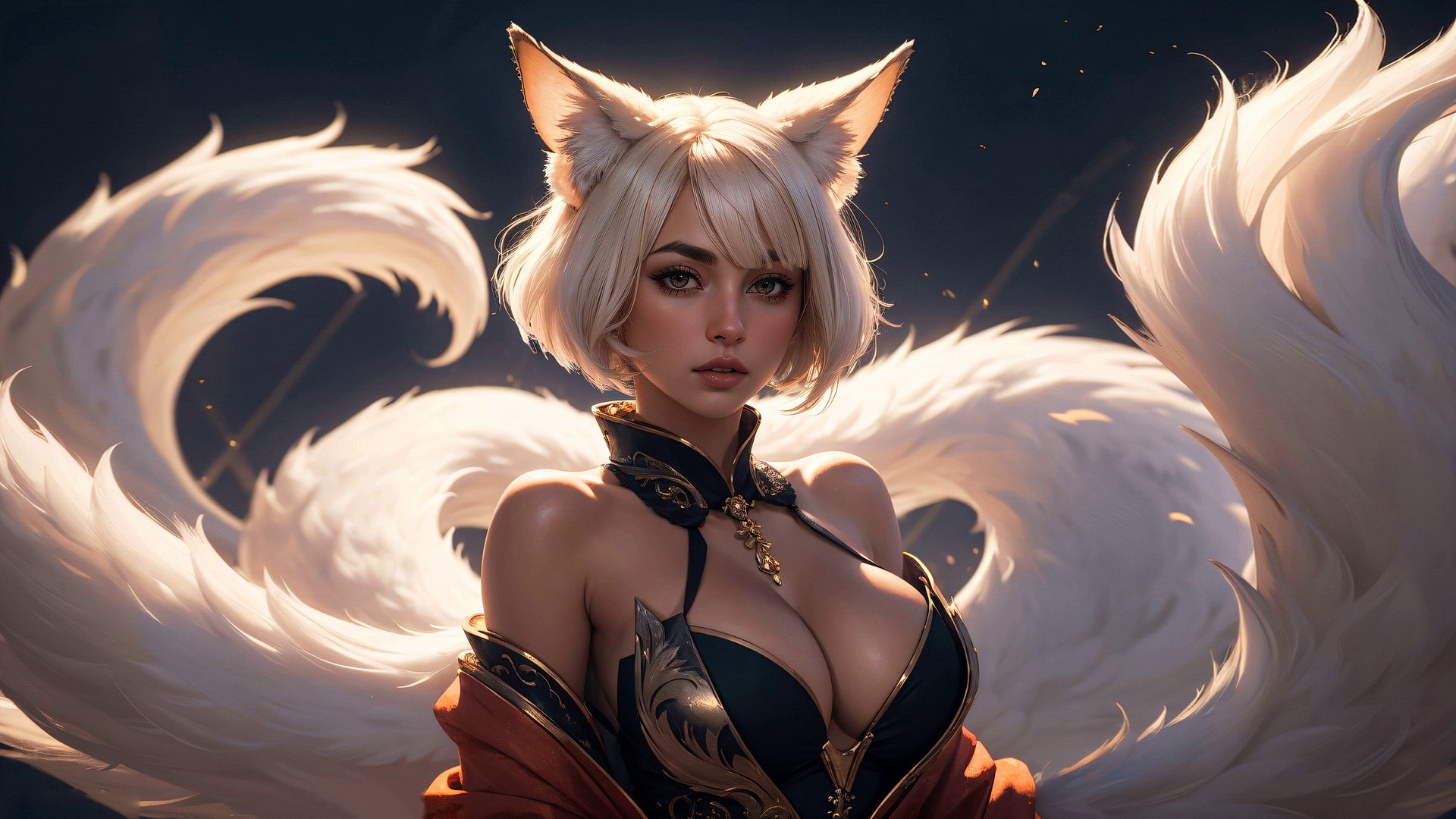 Description: A woman with white hair and a cat costume with wings on her chest and chest.