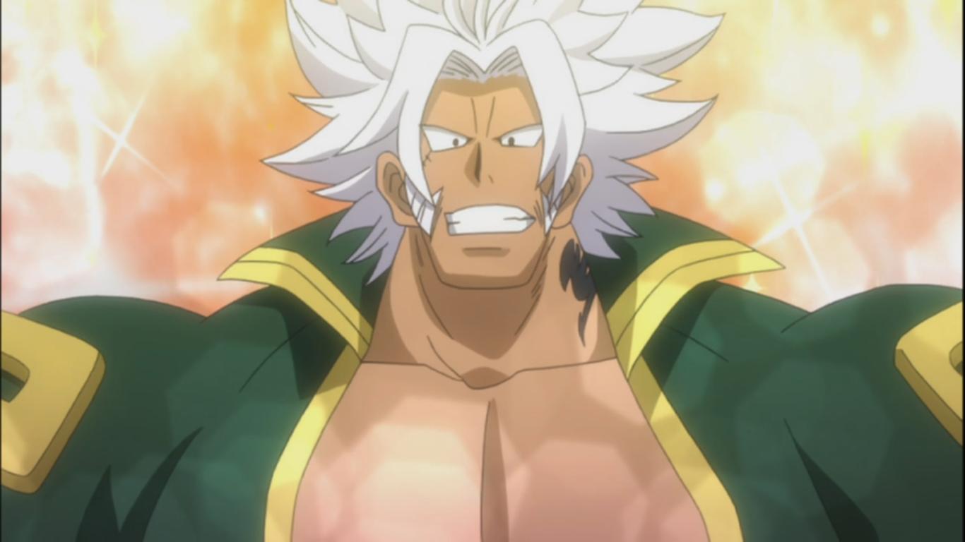 Description: A man with white hair and a green and yellow outfit is standing in front of a fire background with his arms outstretched.