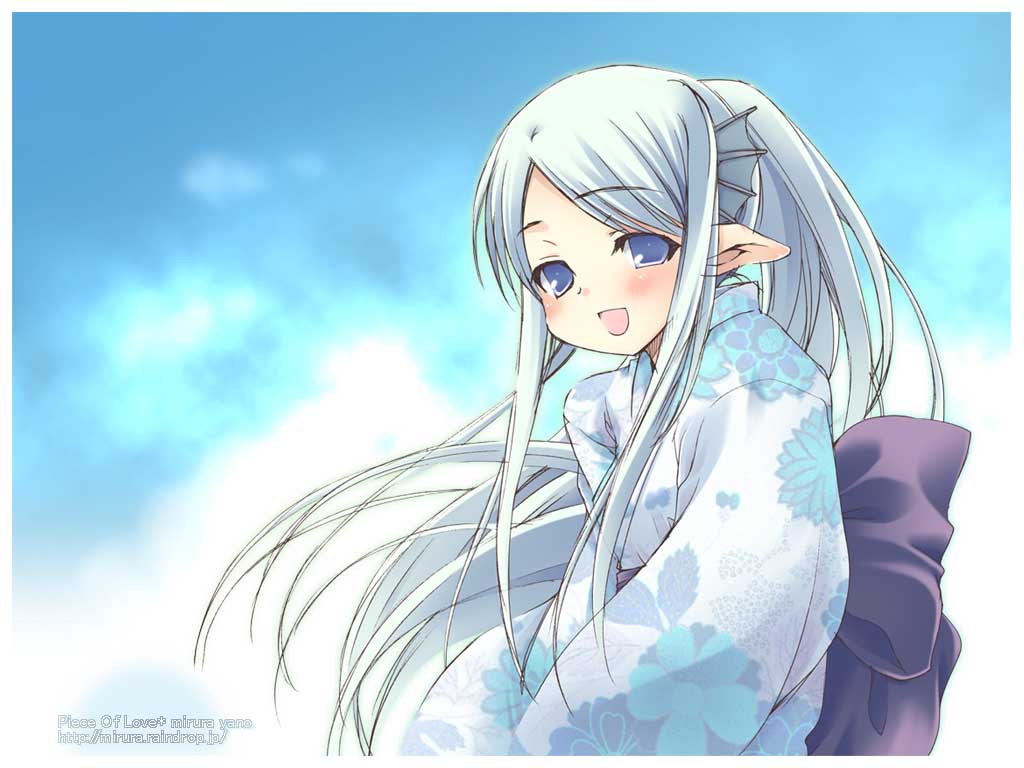 Description: A woman with long white hair and a blue sky background with clouds and clouds behind her is wearing a kimono.