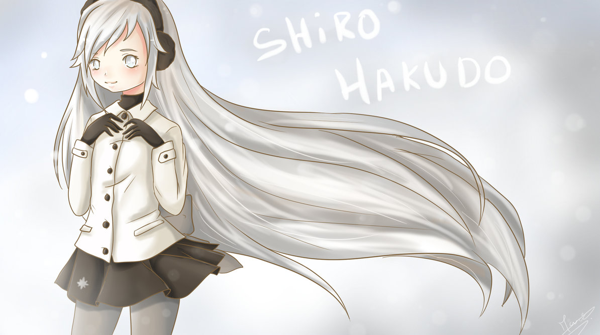 Description: A girl with long white hair and a white jacket with a black bow tie and a white jacket with a black collar.