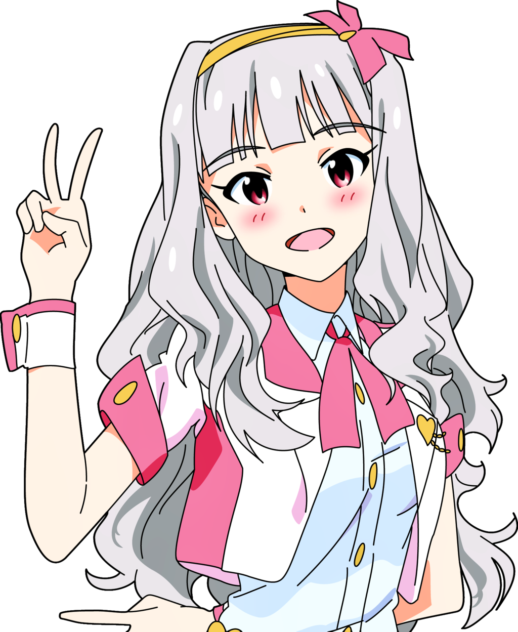 Description: A girl with long white hair and a pink shirt is holding up a peace sign and a pink shirt.
