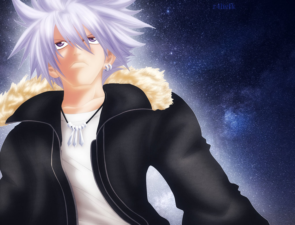 Description: A man with white hair and a black jacket with a fur collar and a white shirt and a black jacket.