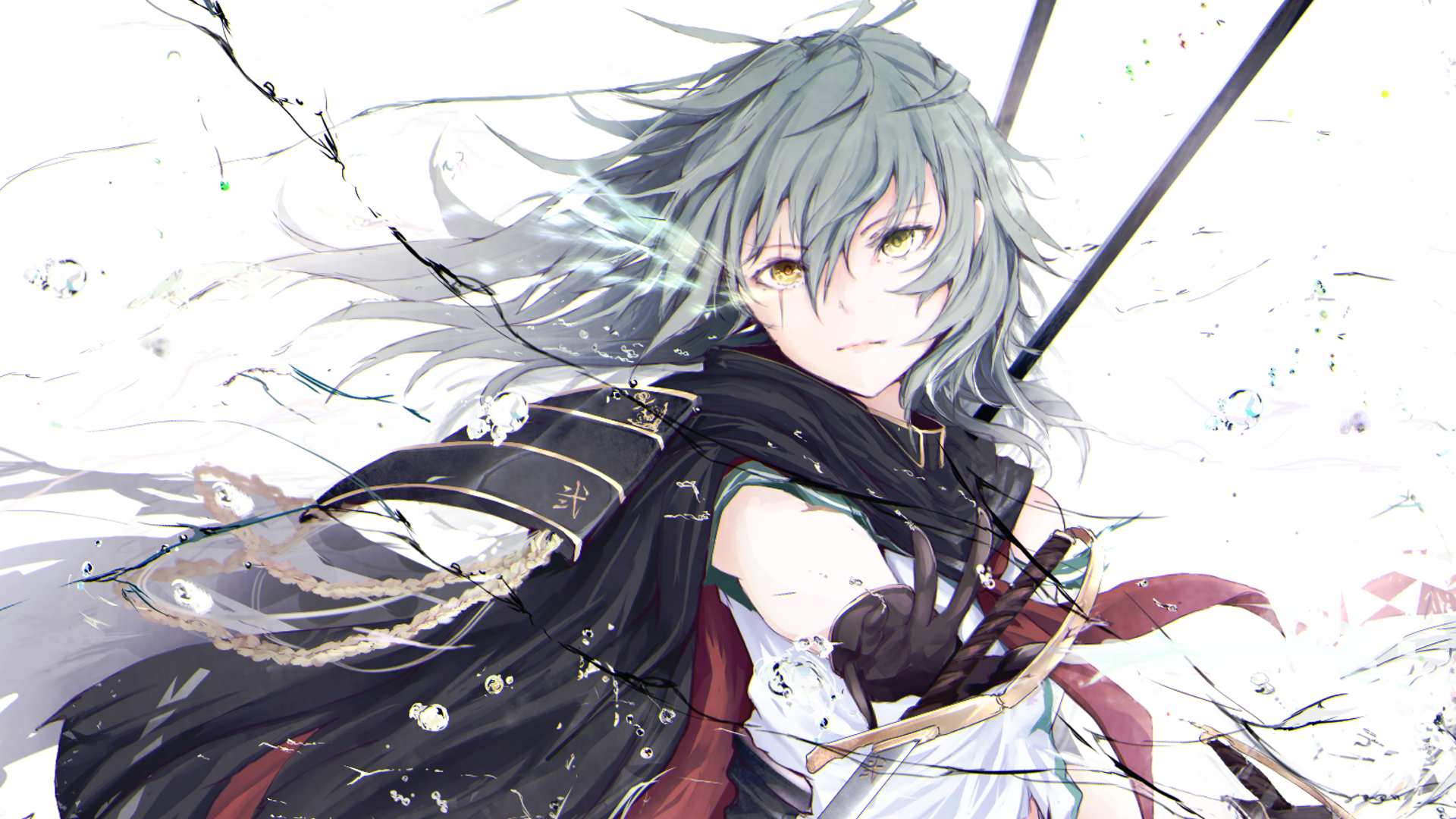 Description: A man with a sword and a black outfit with white hair and a black cape and a red cape.