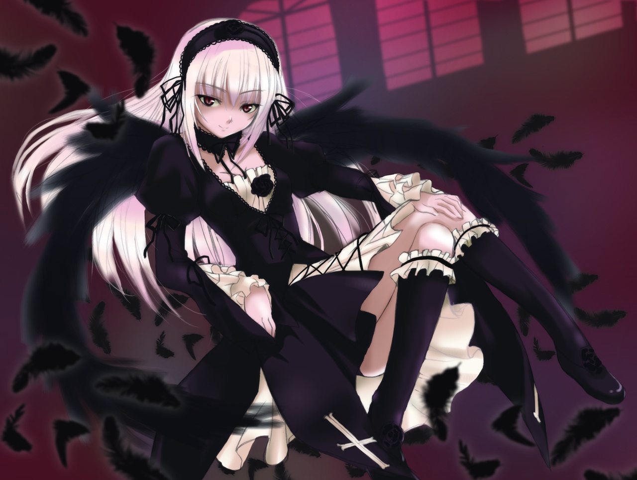 Description: A woman with white hair and black wings sitting on a chair with bats flying around her and a window in the background.